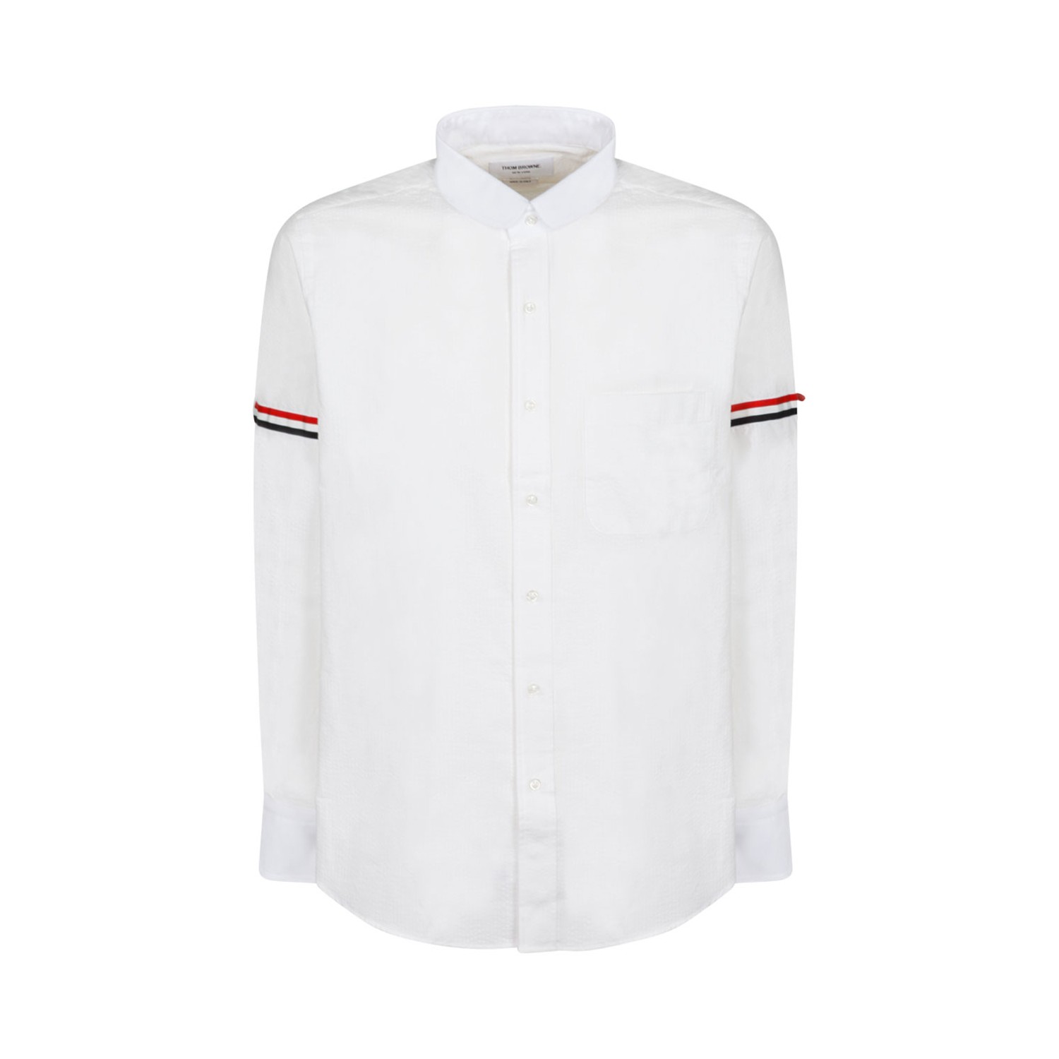 Thom Browne White Arman Detail Shirt. White cotton shirt, front button closure, single patch pocket, signature striped grosgrain loop tab. Pleated back yoke with locker loop, nametag applique above hem, grosgrain armbands.