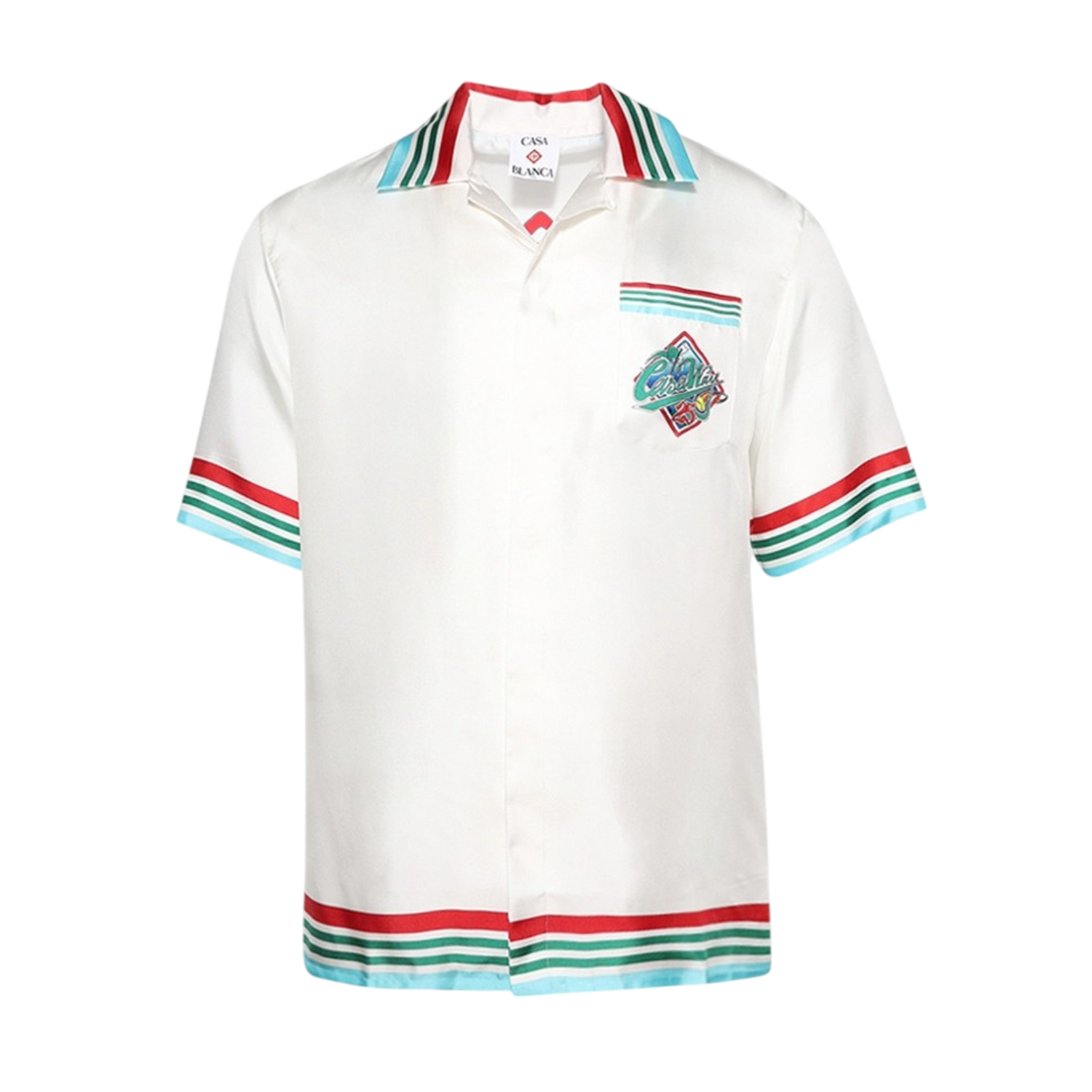 Casablanca Way World Series Shirt. White shirt with concealed front button fastening, short sleeves, chest patch pocket and graphic print at the chest.