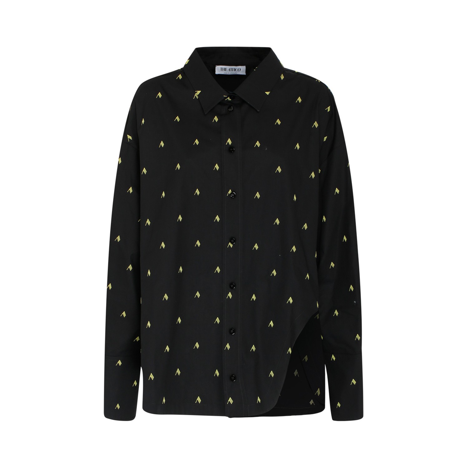 The Attico Black and Yellow Cotton Diana Logo Print Shirt. Black and yellow cotton shirt, all over logo print, oversized silhouette, asymmetric hem. Classic collar, front button fastening, buttons cuffs.