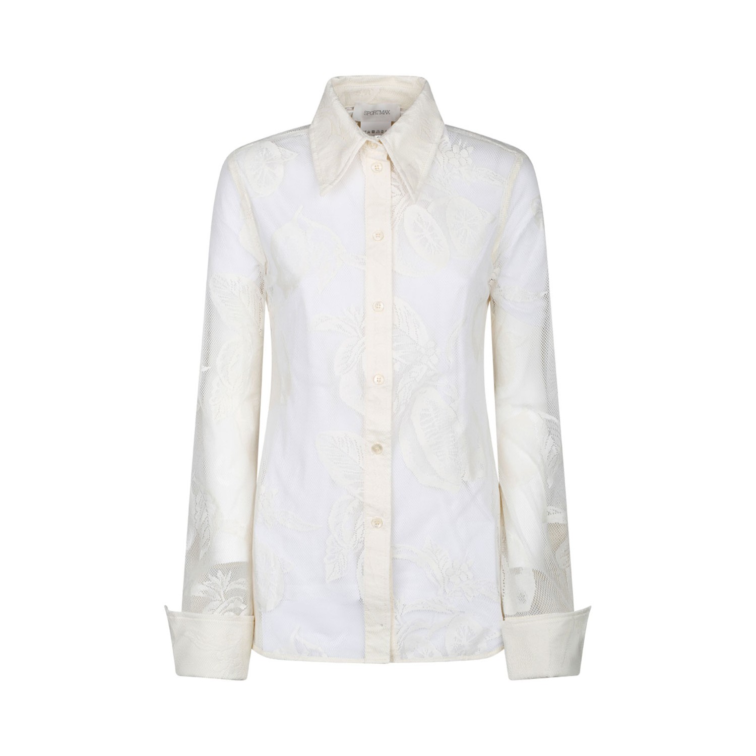 SportMax Ivory White Shirt with long sleeves, classic shirt collar laces details and embroidered ivory details. Transparent effect. Front button fastening.