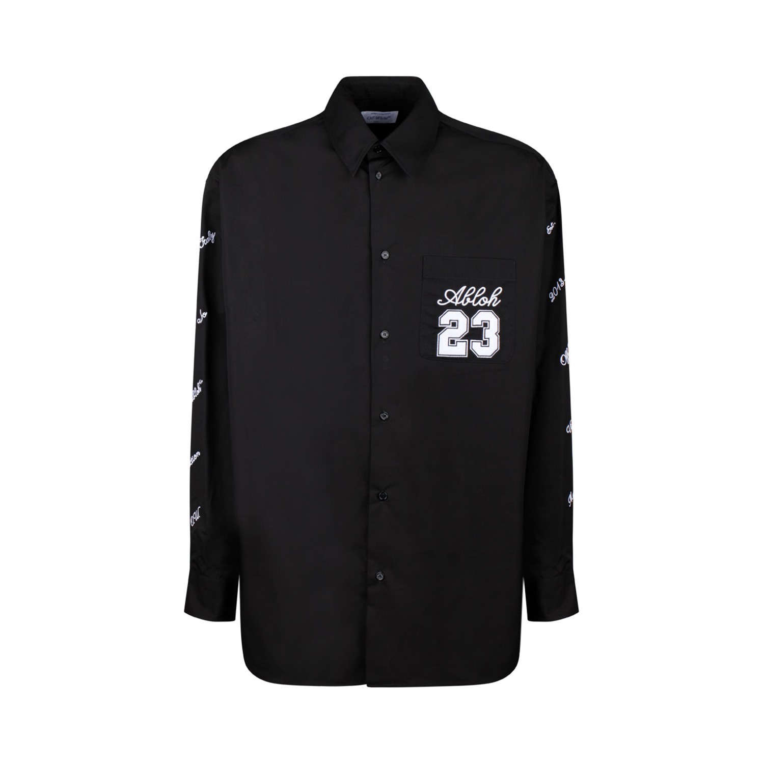 Off White 23 Heavycoat Overshirt. Black cotton overshirt, poplin texture, embroidered logo to the front, sleeves and rear. Pointed flat collar, front button fastening, drop shoulder, long sleeves, buttoned cuffs. Chest patch pocket, curved hem.