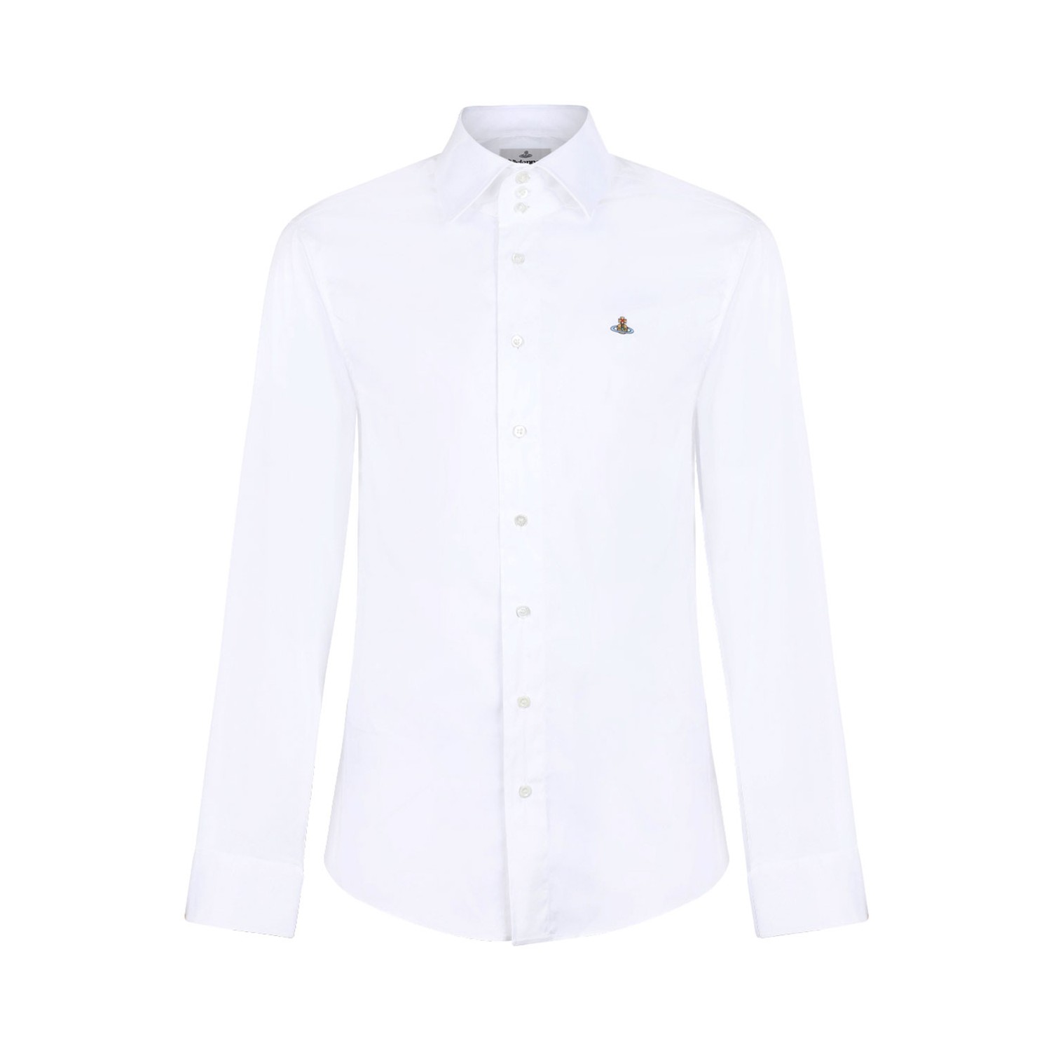 Vivienne Westwood White Logo Embroidered Shirt. White cotton shirt with logo embroidered to the front, classic collar, front button fastening and long sleeves.