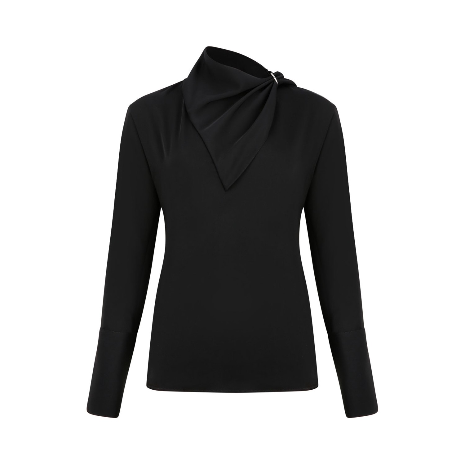 Courreges Black Asymmetrical Blouse. Black asymmetrical blouse with long sleeves, draped scarf detail, curved hem.