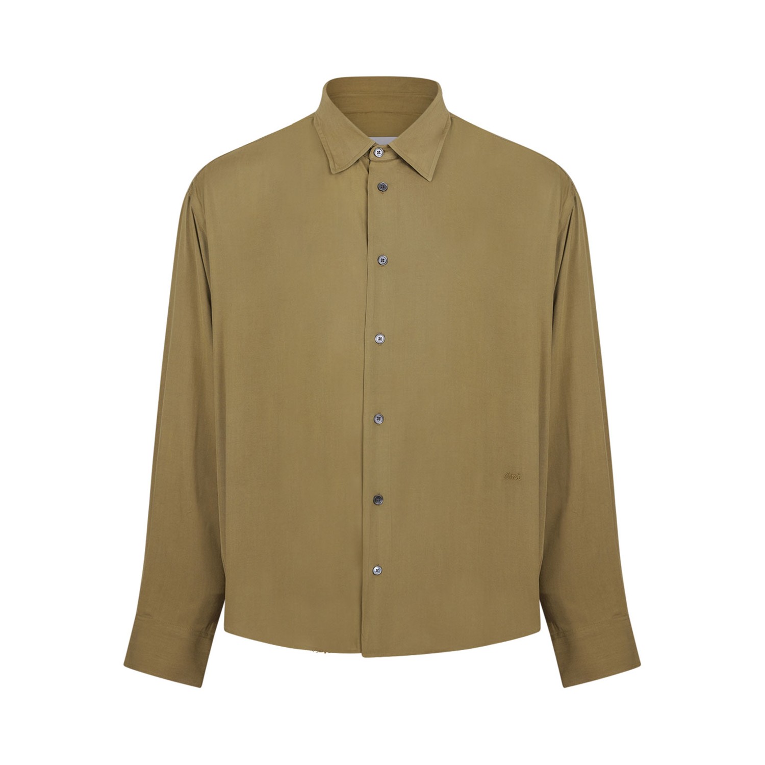 Ami Paris Bronze Embroidered Logo Shirt. Bronze shirt with embroidered logo, button fastening. Long sleeves, curved hem and polo collar.