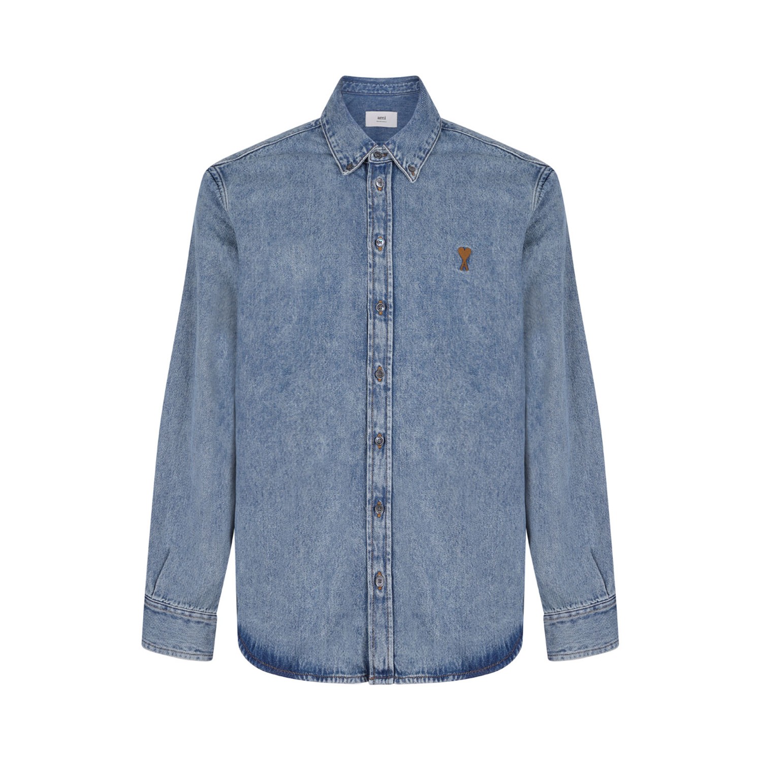Ami Paris Blue Denim Shirt. Blue denim shirt with front button fastening, embroidered logo at the chest, long sleeves and buttoned cuffs.