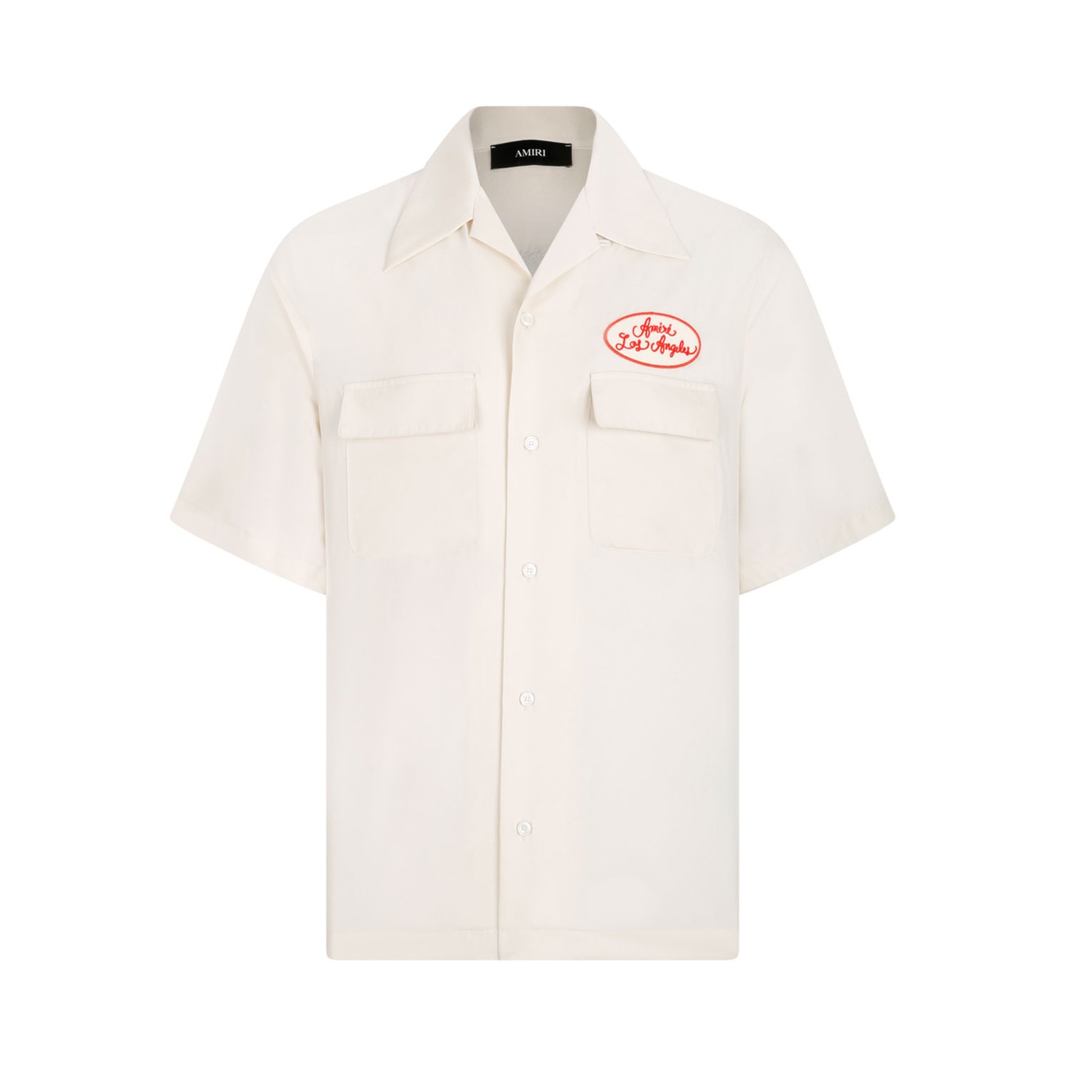 Amiri White Patchwork Short-Sleeve Shirt. White short-sleeve shirt, classic collar, front button fastening, two chest flap pockets, front logo embroidery, multicolor patchwork detailing on the back, straight hem.