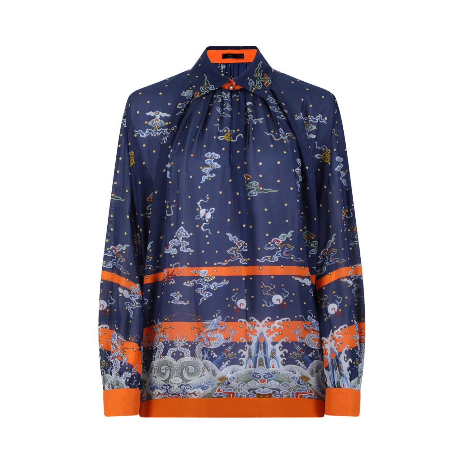 Hui Milano Blue Print High Neck Shirt. Blue shirt with mythological motifs, orange stripes.