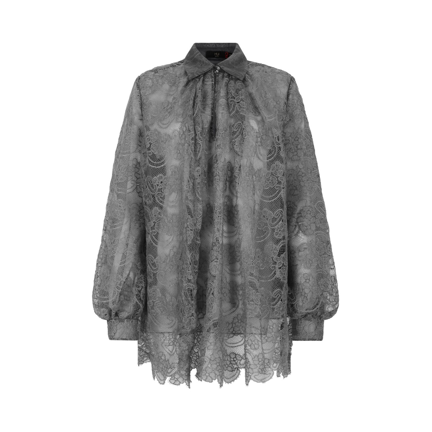 Hui Milano Grey Sheer Lace Blouse. This sheer gray lace blouse combines elegance and romance in every detail. The body is embellished with refined patterns, while the lantern sleeves add a delicate, retro touch. The lower edge of the lace maintains a natural lace finish, expressing a sophisticated and timeless elegance. Light and airy, it can be worn alone to accentuate femininity or as a midlayer under a coat, effortlessly adapting to a variety of luxurious looks.