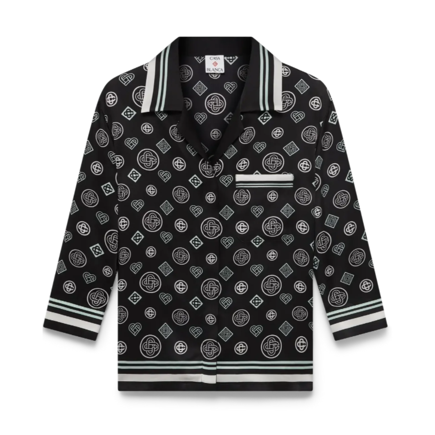 Casablanca Black Monogram Pyjama Silk Satin Shirt. The monogram silk satin pyjama shirt is an all-over printed design featuring the season's Honeydew logo print. This repeat differs from our other monograms, as it combines unique shapes to form a cohesive pattern. It is more of an icon-based design. Completed with mid-length sleeves, a breast pocket, a Cuban collar, button closure, signature interlocking CC logo buttons, and black and white stripe details on the collar, cuffs, hem and pocket detail.