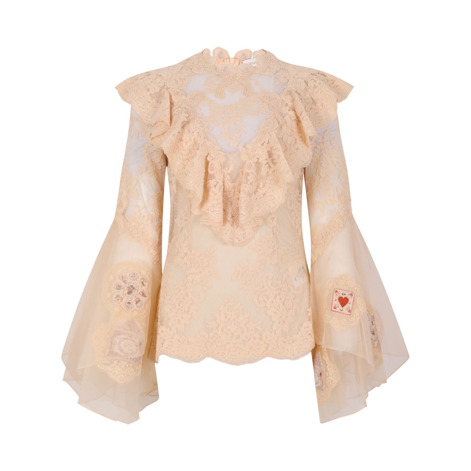 Zimmermann Cream Ruffled Lace Shirt. Cream ruffled lace shirt with flared sleeves, applique detail and high neck.