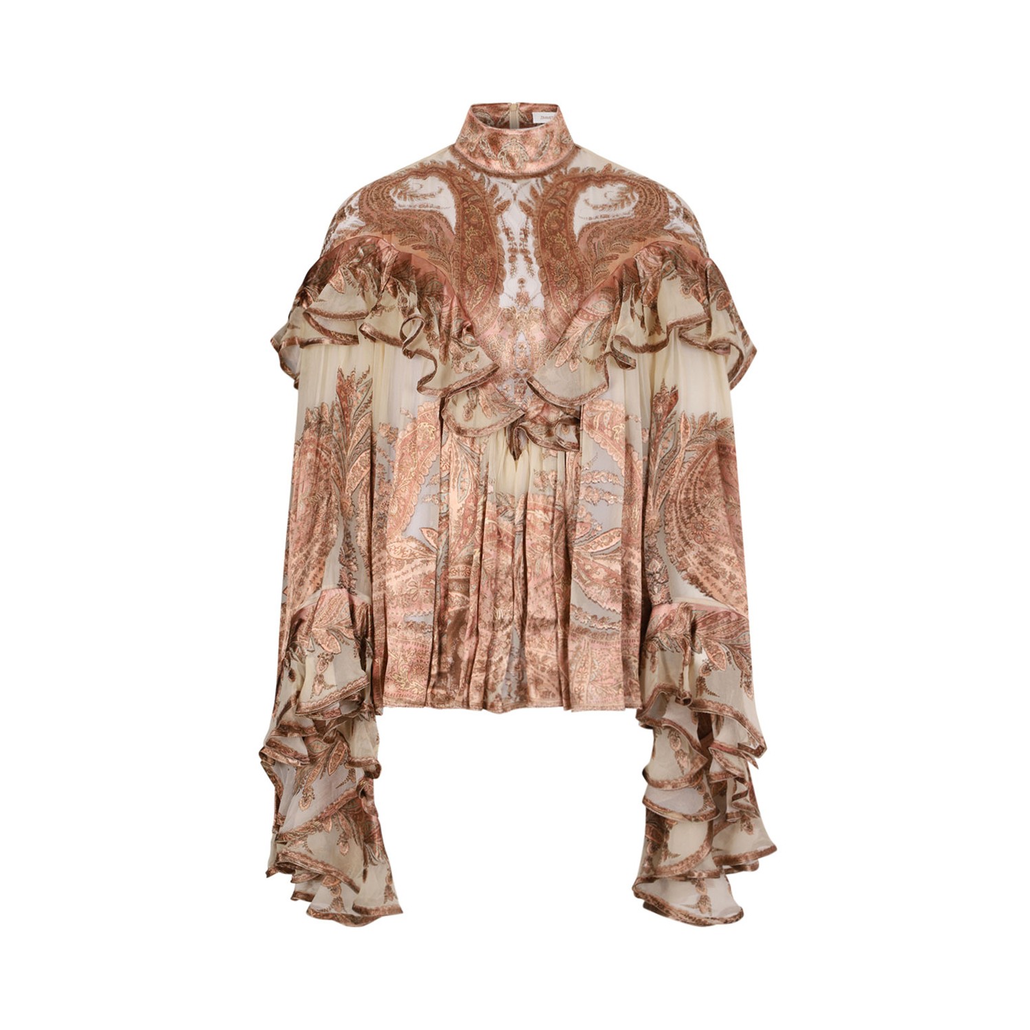 Zimmermann Cream Paisley Hypnotic Burnout Blouse. Paisley blouse with invisible zip closure at centre back neck, high neckline. Long wide sleeves with exaggerated cuffs, gathered frills across chest and hem.