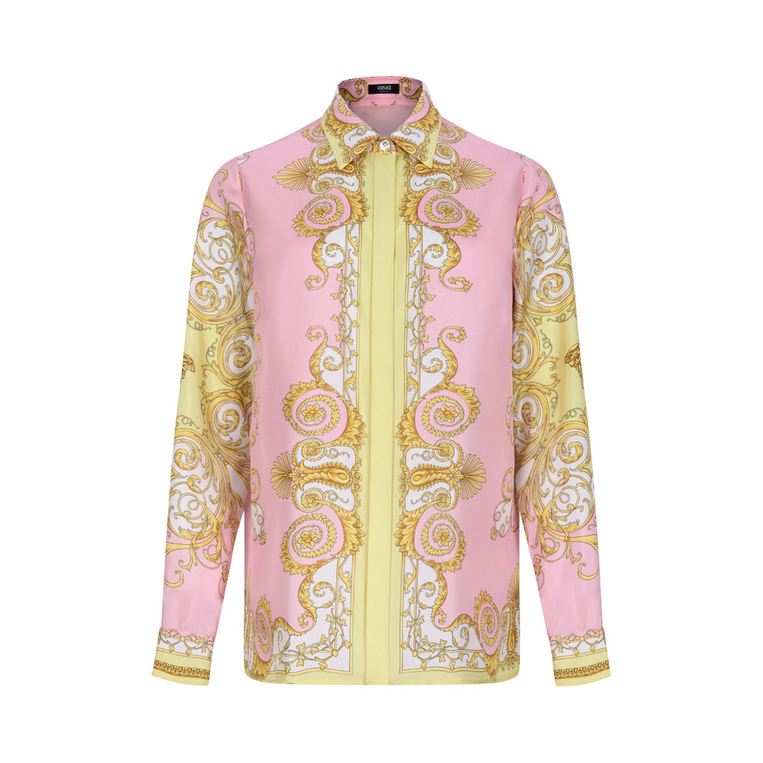 Versace Multicolour Silk Shirt. Multicolour silk shirt with long sleeves, classic collar, all-over baroque pattern. The front of the shirt, cuffs, and collar are adorned with a symmetrical motif, while the back is finished with an exquisite gold emblem set against a yellow background.