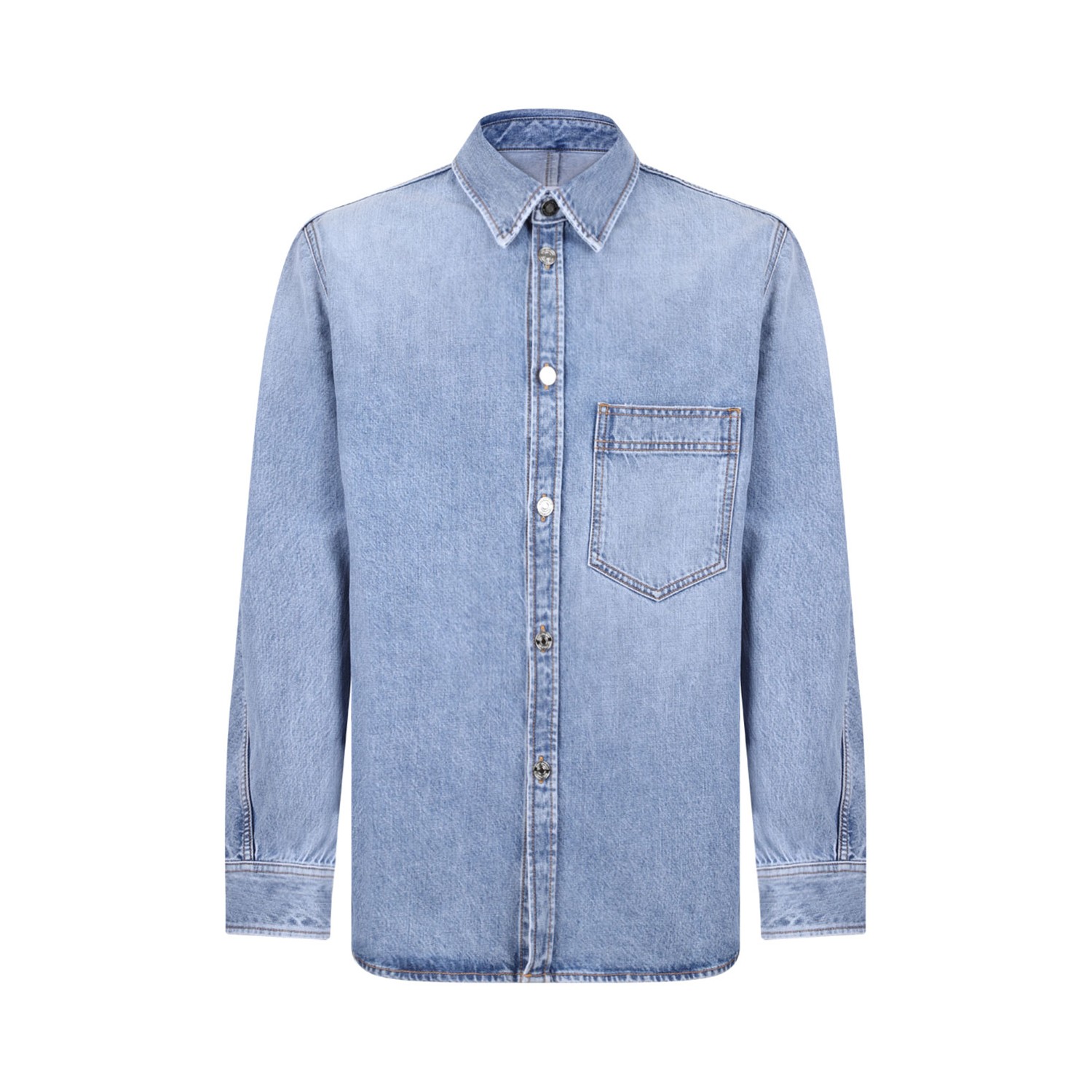 Givenchy Light Blue Denim Overshirt. Light blue denim overshirt featuring long-sleeved in washed denim, classic collar, GIVENCHY suede leather patch on the upper back, GIVENCHY engraved buttons, button closure, buttoned cuffs, one chest pocket and relaxed fit.