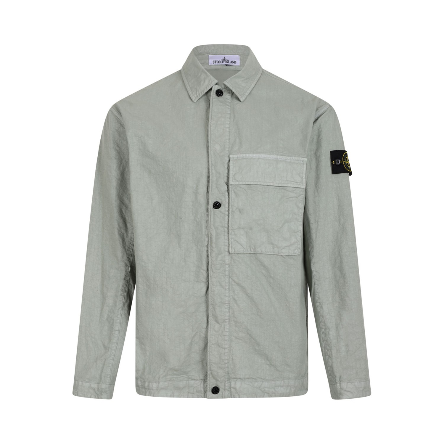 Stone Island Sage Green Comfort-Fit Overshirt With Pocket. Sage green overshirt made from an innovative made in Japan 100% nylon fabric with an impressive organic appearance. The super thin nylon extrusions are cut, mixed, blown, carded, twisted and spun to mimic natural fibres. The resulting panama weaved calendered fabric is lighter and stronger than natural fabrics. The garment dyeing procedure, thanks to the uneven penetration into the calendered fabric, lends a marbled look to the surface. Garment dyed using specific recipes.