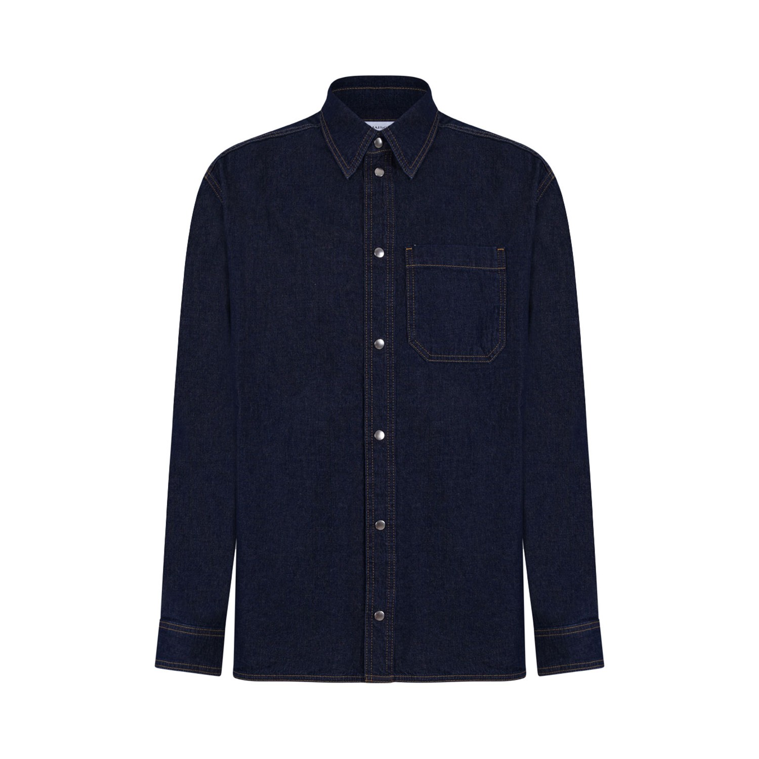 Maison Kitsune Indigo Blue Oversized Shirt. Indigo blue light Japanese denim shirt with oversize fit, classic collar. Maison Kitsune engraved snap button closure, patch chest pocket, contrasted topstitching. Long sleeves with straight buttoned cuffs and rounded hem.