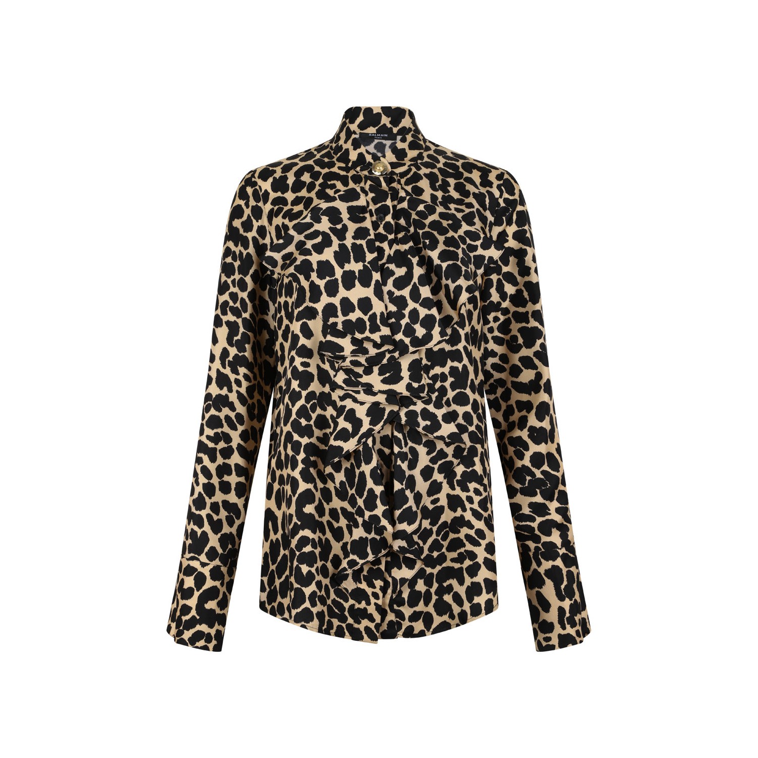 Balmain Ruffled Leopard-Print Shirt. Leopard print shirt with front button fastening, buttoned-cuff sleeves, stand-up collar and curved hem.