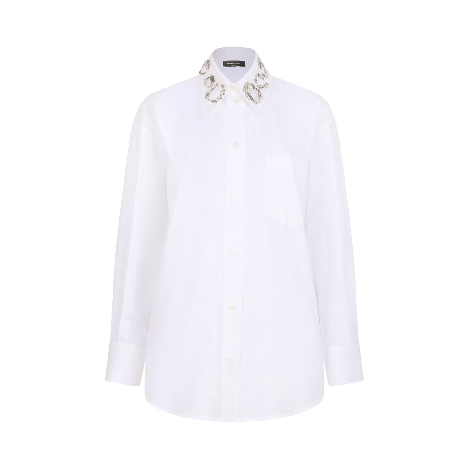 Fabiana Filippi White Long Poplin Shirt With Crystal Embellished. Timeless elegance meets contemporary lines in this long poplin shirt, embellished with hand-embroidered Holes. Inspired by Alberto Burri's plastic combustions, each piece is individually applied with precious embellishments of set crystals and rhinestones. Made in Italy using sustainable processes.