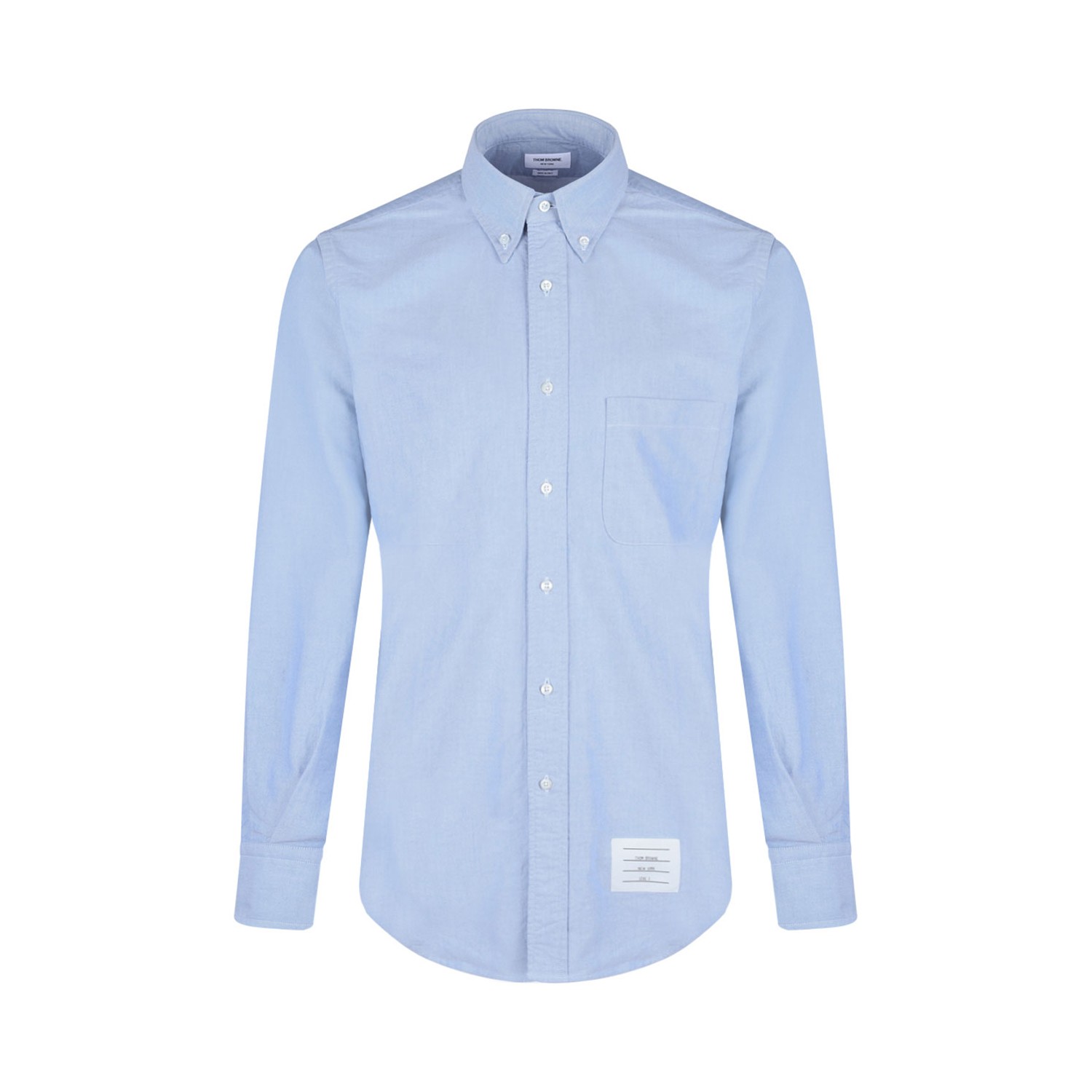 Thom Browne Light Blue Button Up Shirt. Light blue cotton shirt, tonal stitching, button-down collar, front button fastening. Long sleeves, buttoned cuffs, chest patch pocket, curved hem.