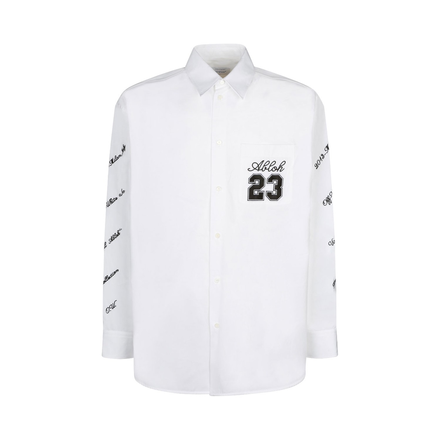 Off White White and Black Logo Embroidered Shirt. White and black cotton shirt, embroidered logo, number patch to the front, straight point collar. Front button fastening, long sleeves, curved hem.