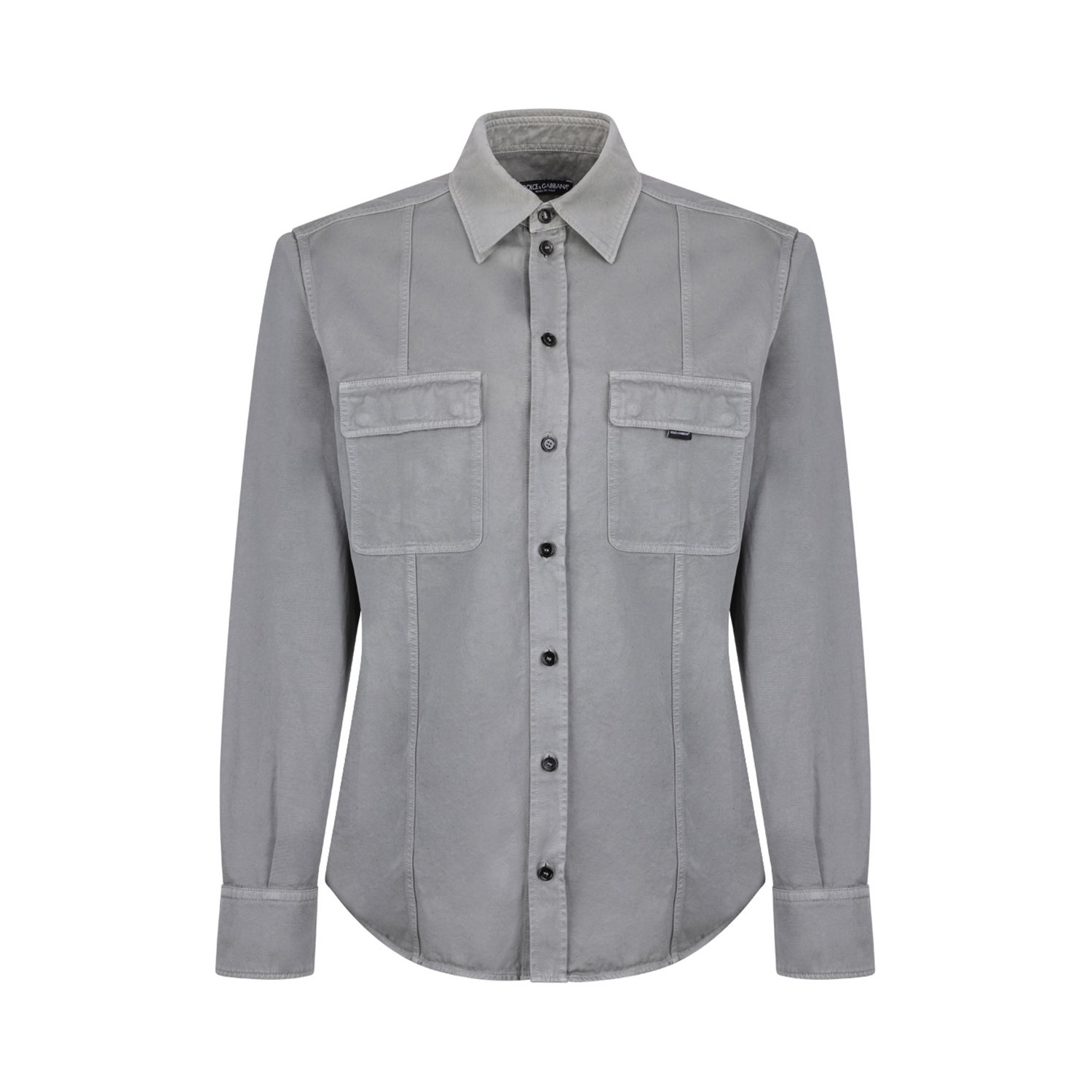 Dolce & Gabbana Dark Grey Seam-Detail Shirt. Dark grey cotton seam detailing shirt with mini logo tag, classic collar, front button fastening. Long sleeves, buttoned cuffs and two chest flap pockets.
