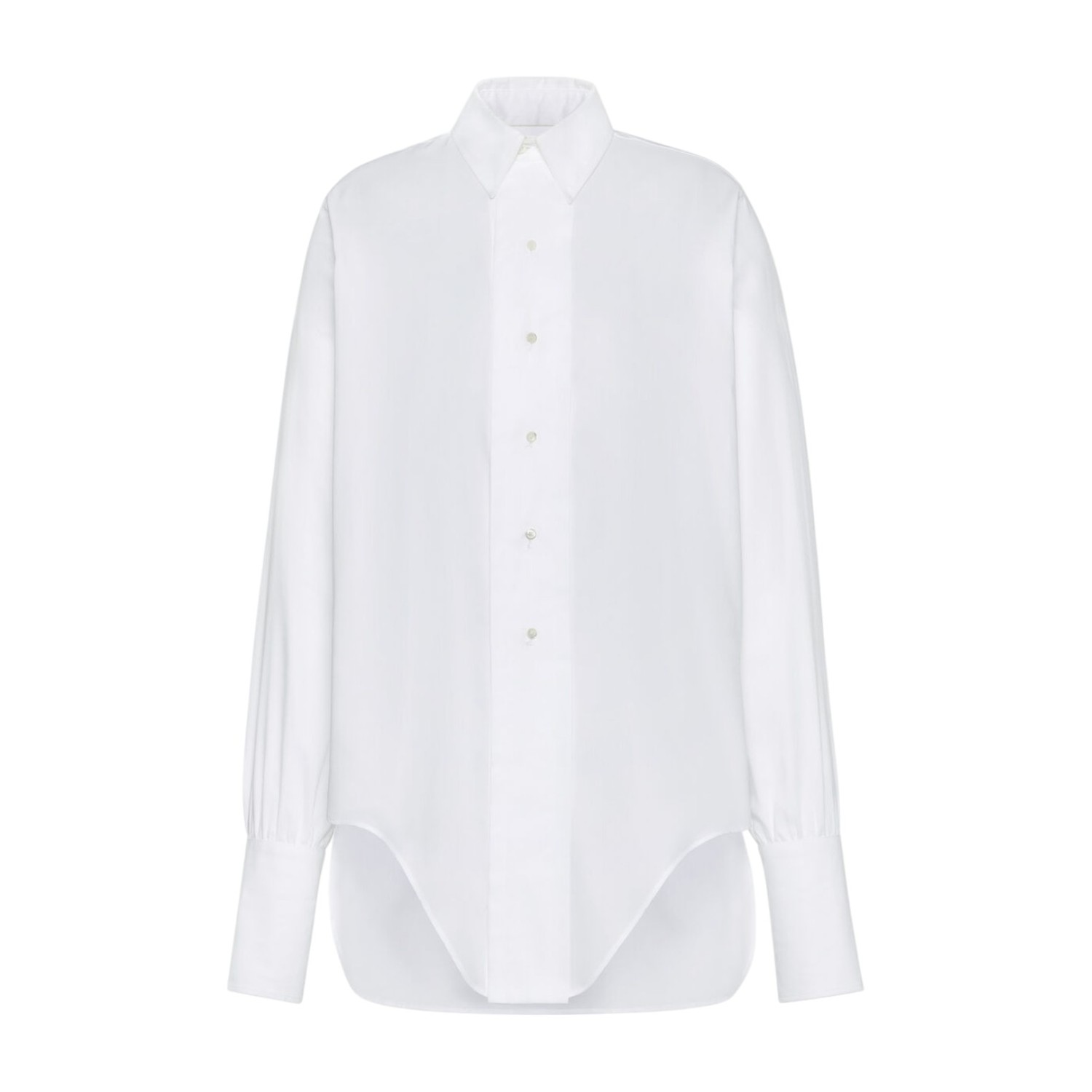 Maison Margiela White Cotton Shirt. White cotton shirt with long-sleeved, pointed collar, front button fastening. Oversized cuffs with button closure, curved, pointed front hem, straight back hem.