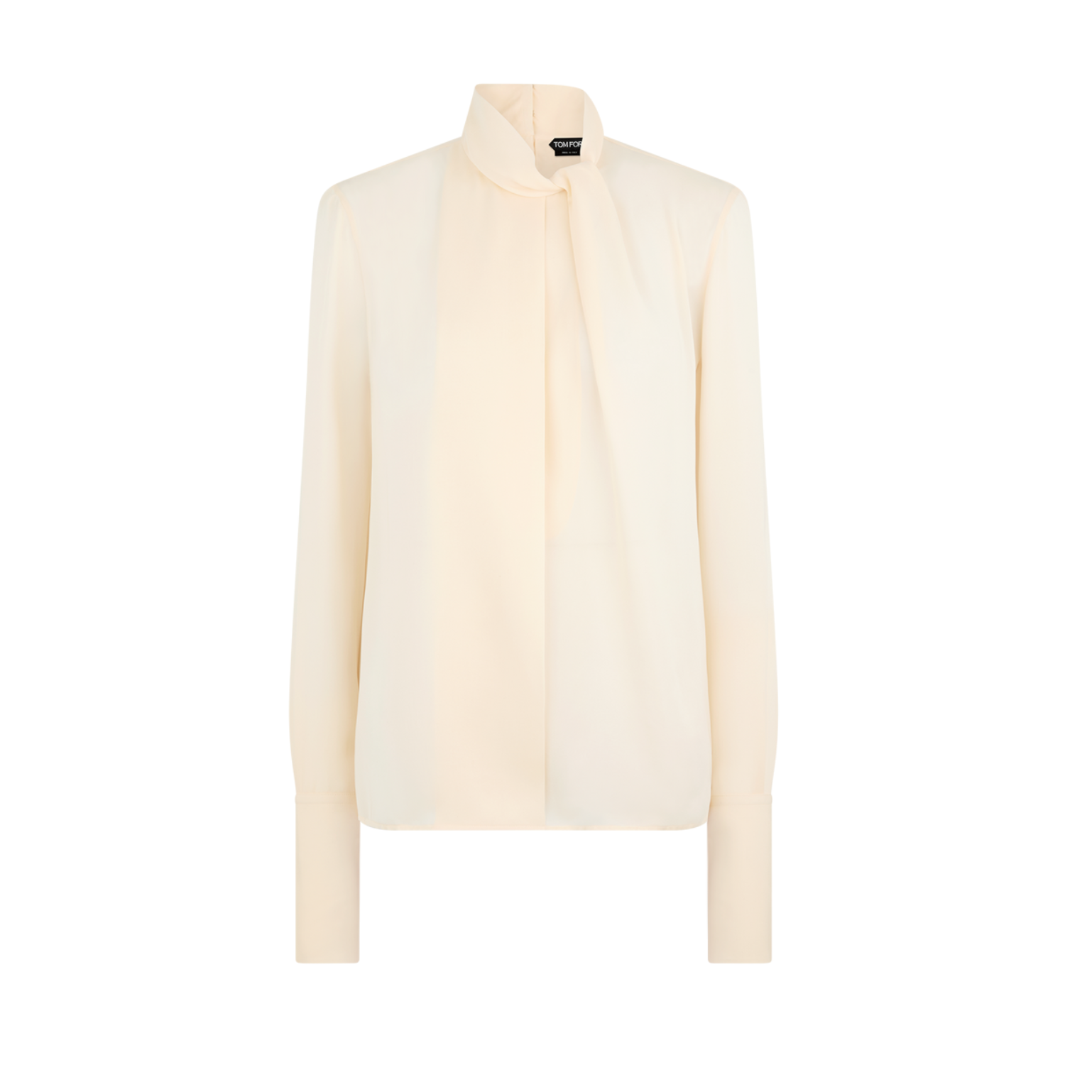 Tom Ford Ivory Washed Silk Georgette Long Sleeve Blouse. Crafted in fluid washed silk georgette, this long sleeve blouse features a softly draped collar with a subtle cut out that reveals just enough. A deep knife pleat defines the front, while a delicate kissing pleat at the back adds controlled movement. Finished with a concealed hook and eye closure at the collar and self covered buttons at the cuffs, this piece captures TOM FORD's sensuality.