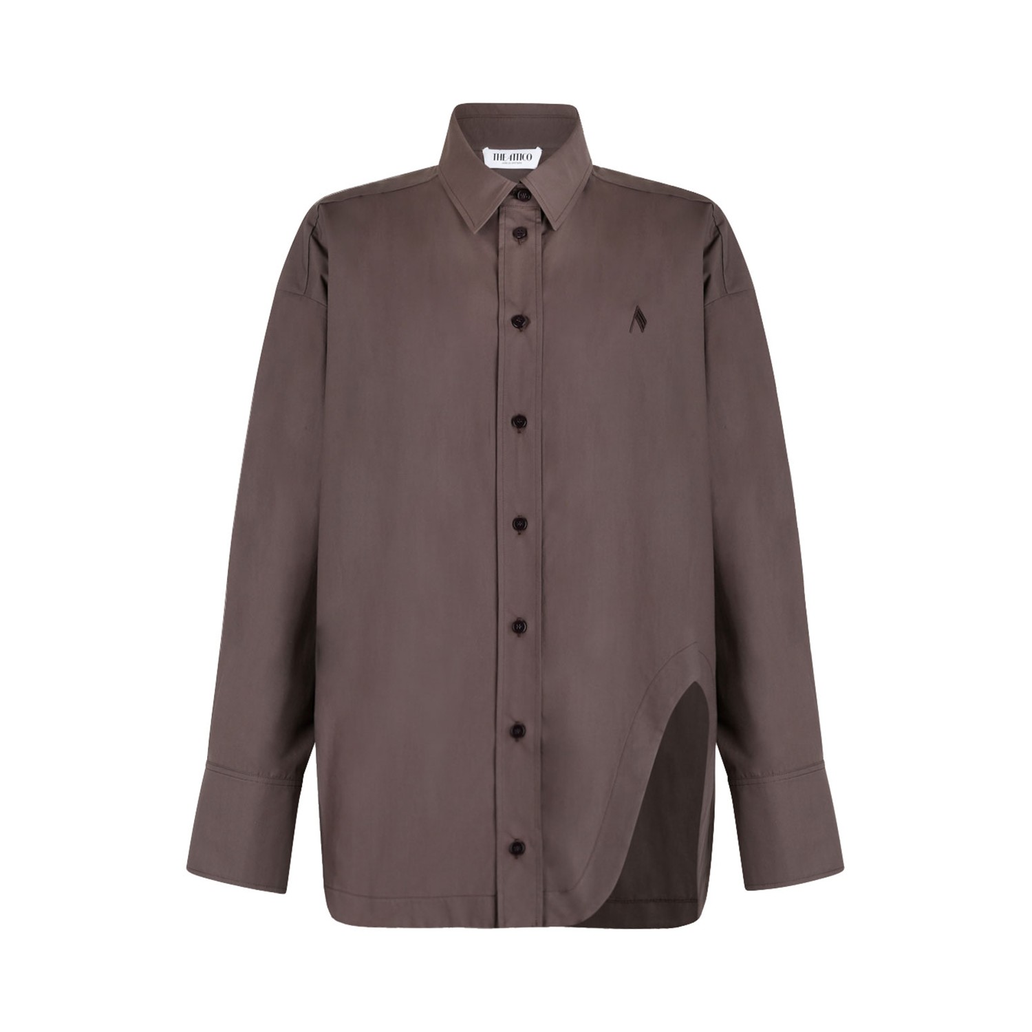 The Attico Dark Brown Diana Shirt. Dark brown popeline shirt with front button fastening, cut-out detail, embroidered logo to the chest, long sleeves and buttoned cuffs.