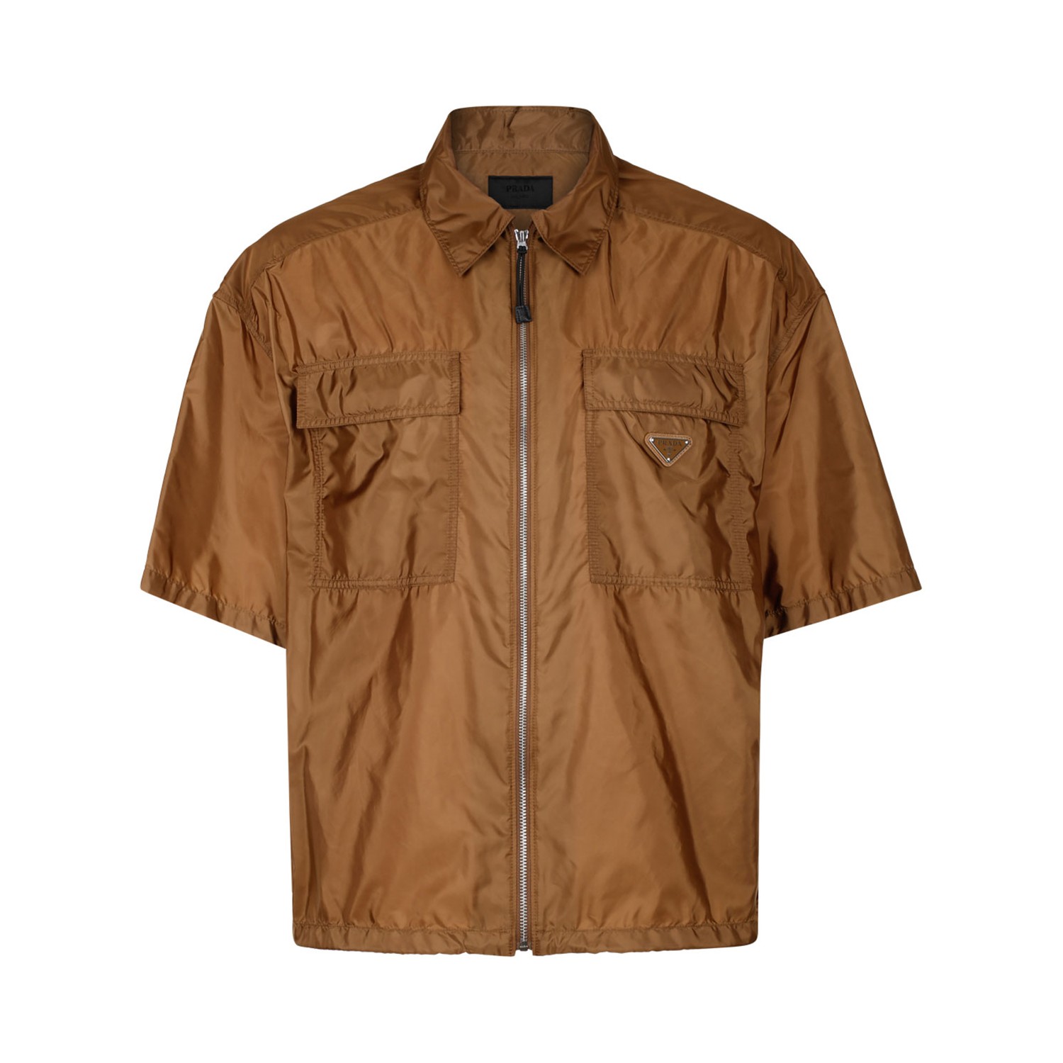 Prada Brown Re-Nylon Shirt. Brown recycled nylon shirt, front zip fastening, two chest flap pockets, short sleeves, drawstring hem.
