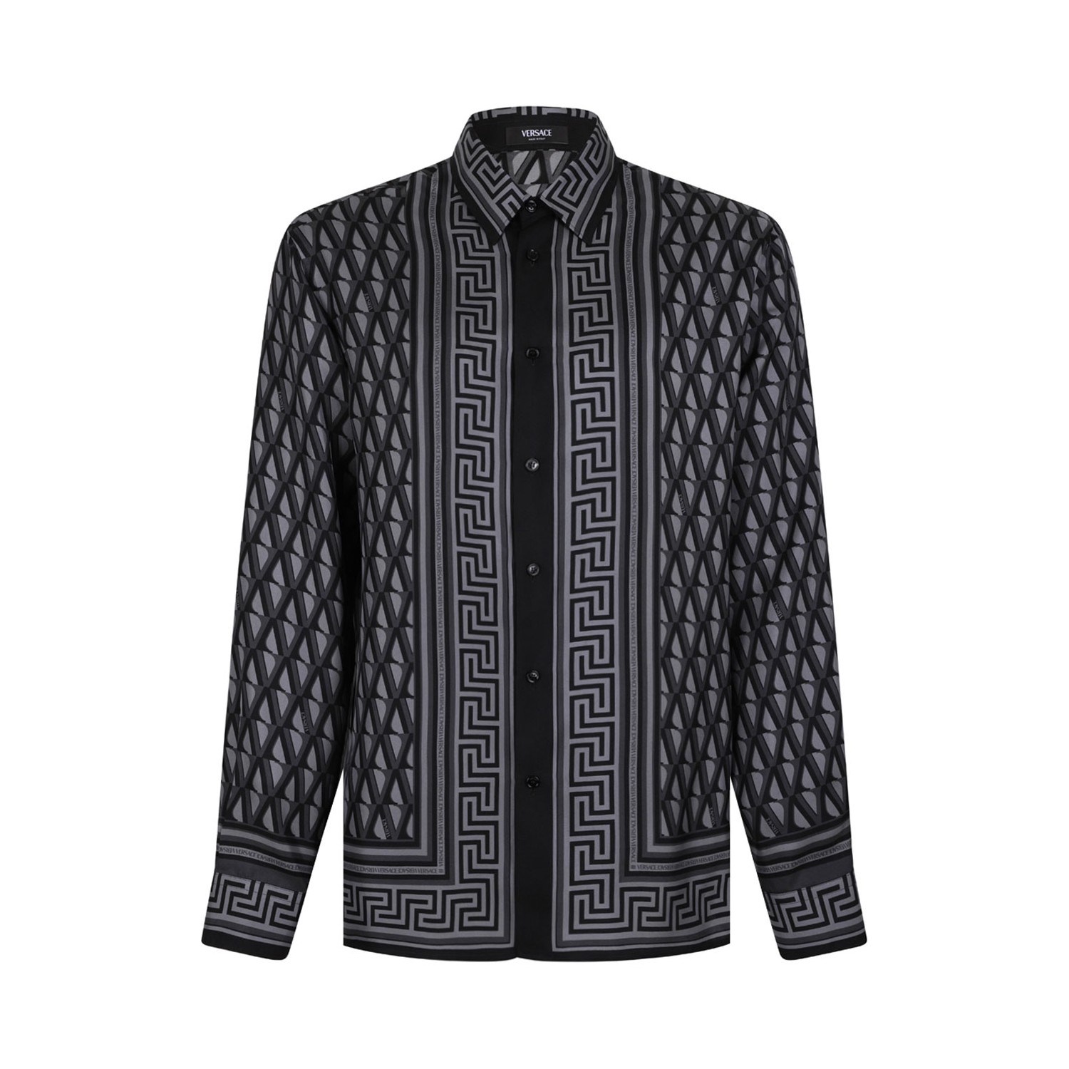 Versace Black and Grey Printed Silk Twill Regular Shirt. Black long-sleeved regular-fit shirt in silk twill featuring an all-over V and Greca motif. Pointed collar, front button closure, buttoned cuffs.
