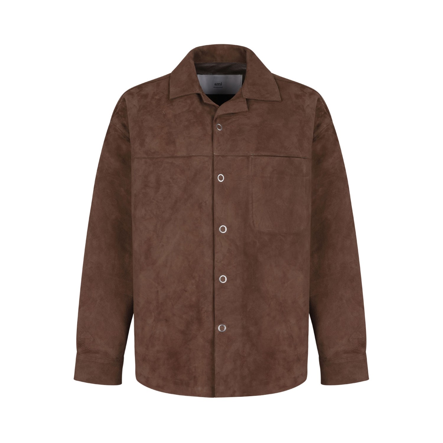 Ami Paris Brown Leather Overshirt. Brown overshirt in goat suede leather with press buttons eyelet head, metal eyelets engraved "ami paris". Ami de Coeur topstitched embossed logo on the back under collar and unlined.