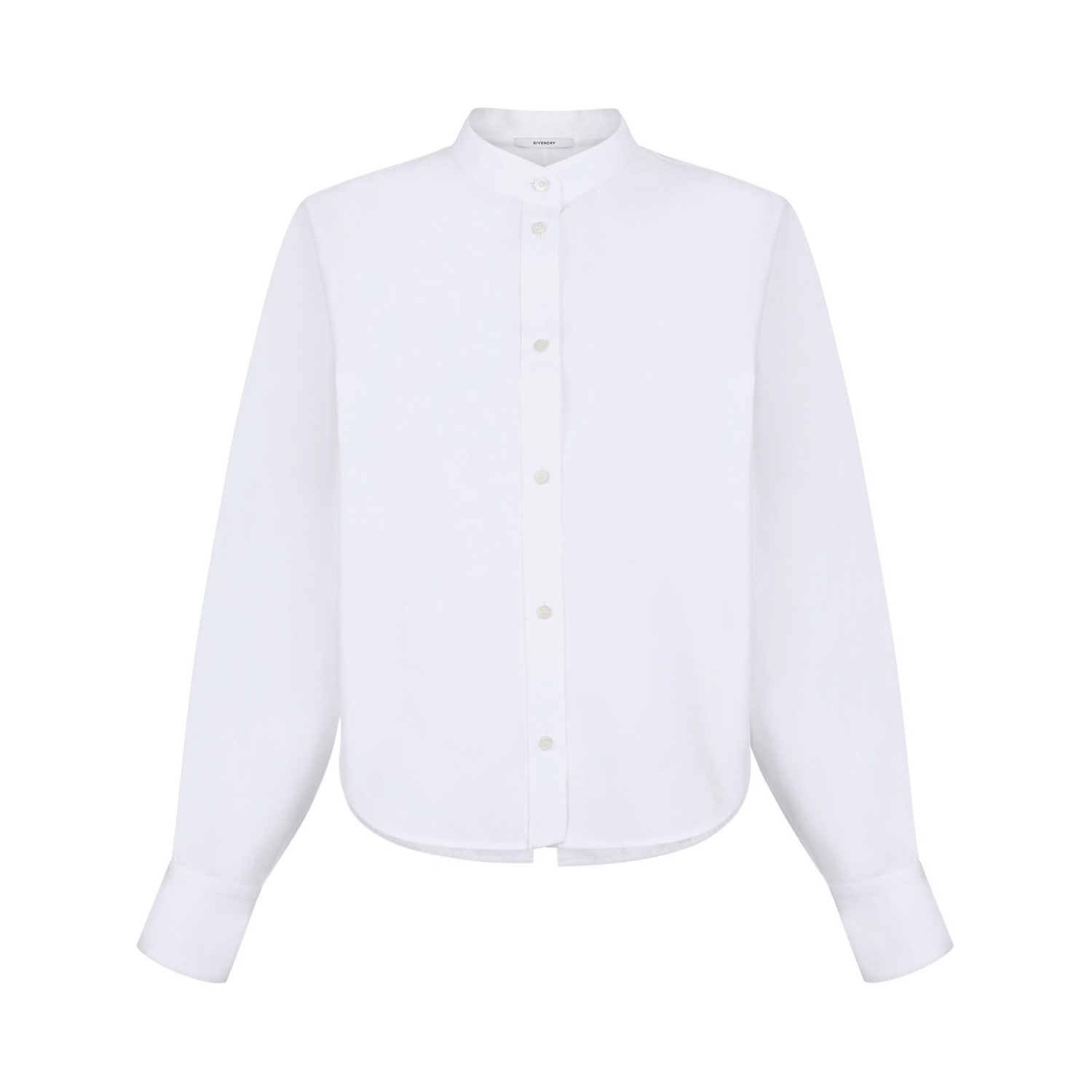 Givenchy White Cocoon Cut-Out Shirt In Popeline. White long-sleeved shirt in cotton poplin with Mandarin collar, button closure. Cuffs with buttons and cut-out on the back. Couture stitching for an enveloping volume.