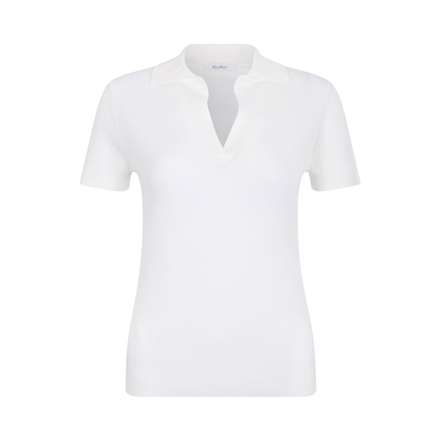 Max Mara White Ribbed Wool Polo Shirt. White short-sleeved polo shirt, entirely ribbed. Open front polo collar, set-in sleeves and straight bottom.
