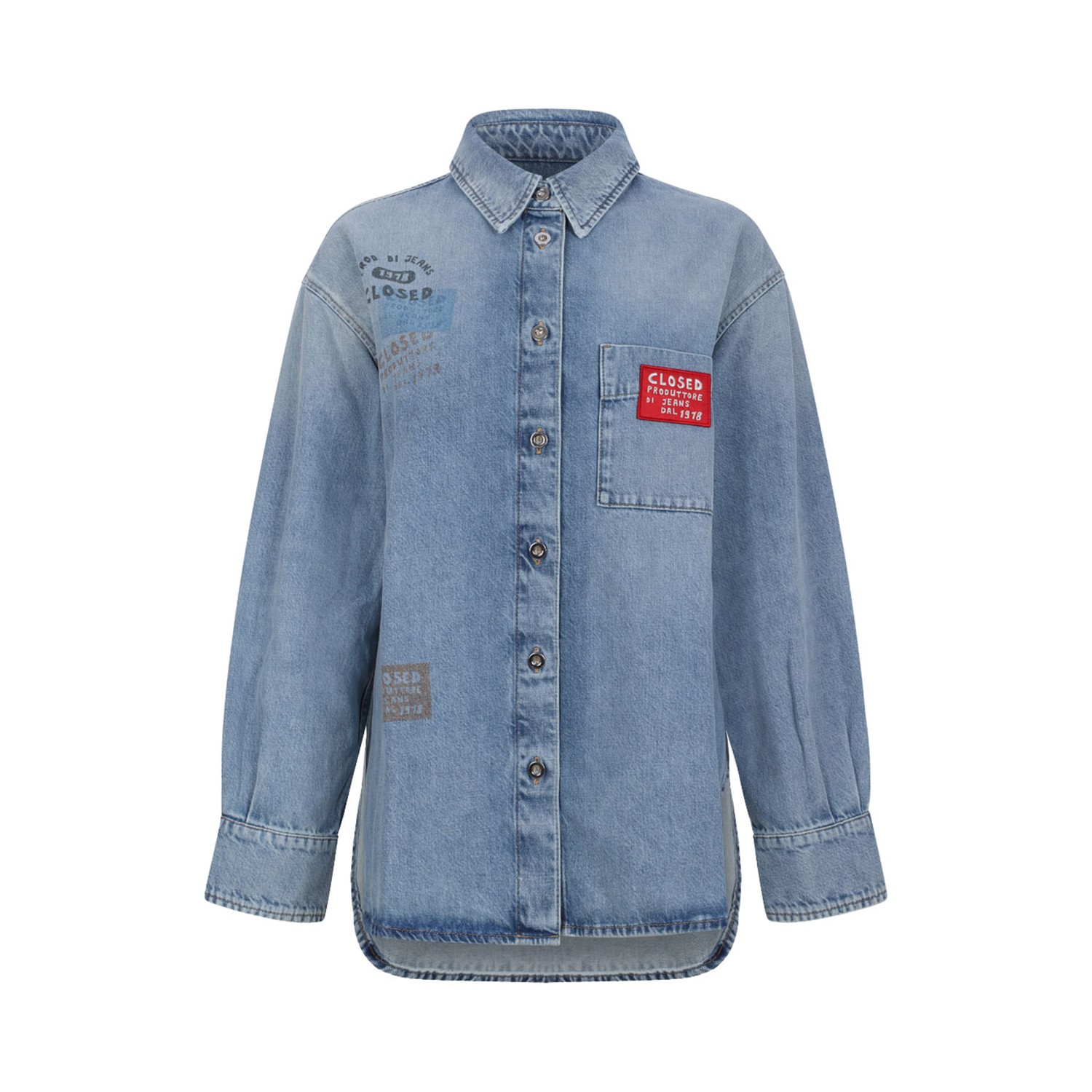 Closed Mid Blue Chemise Oversized Shirt. Mid blue cotton chemise oversized shirt with classic collar, silver button fastening, one patch chest pocket.
