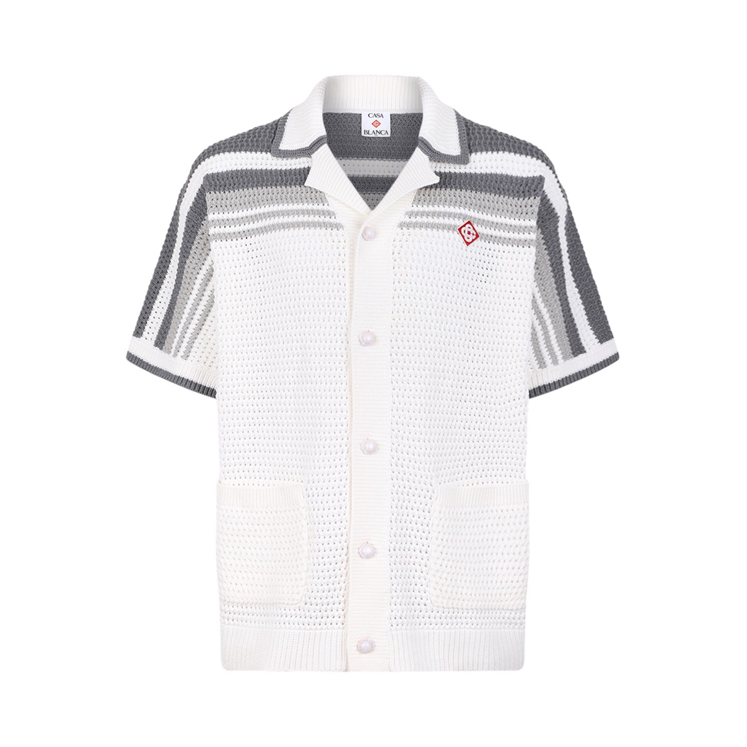Casablanca White Crochet Shirt. White short-sleeved shirt made of pure cotton crochet enriched with a logo application on the chest. Lapel collar, front button fastening and ribbed profiles.