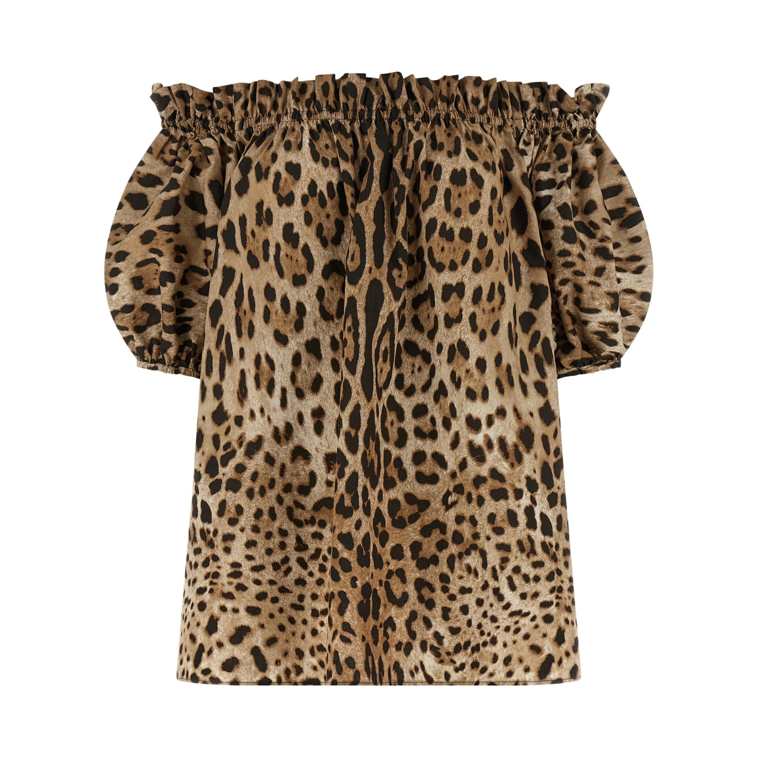 Dolce & Gabbana Leopard-Print Off-Shoulder Blouse. Leopard-print off-the-shoulder blouse with a bold, feminine silhouette. Blouse crafted in stretch cotton poplin with an all-over iconic animalier motif. Featuring a straight Bardot neckline with gathered ruffle detail, short balloon sleeves with elasticated cuffs and a flared shape for a sophisticated, statement finish.