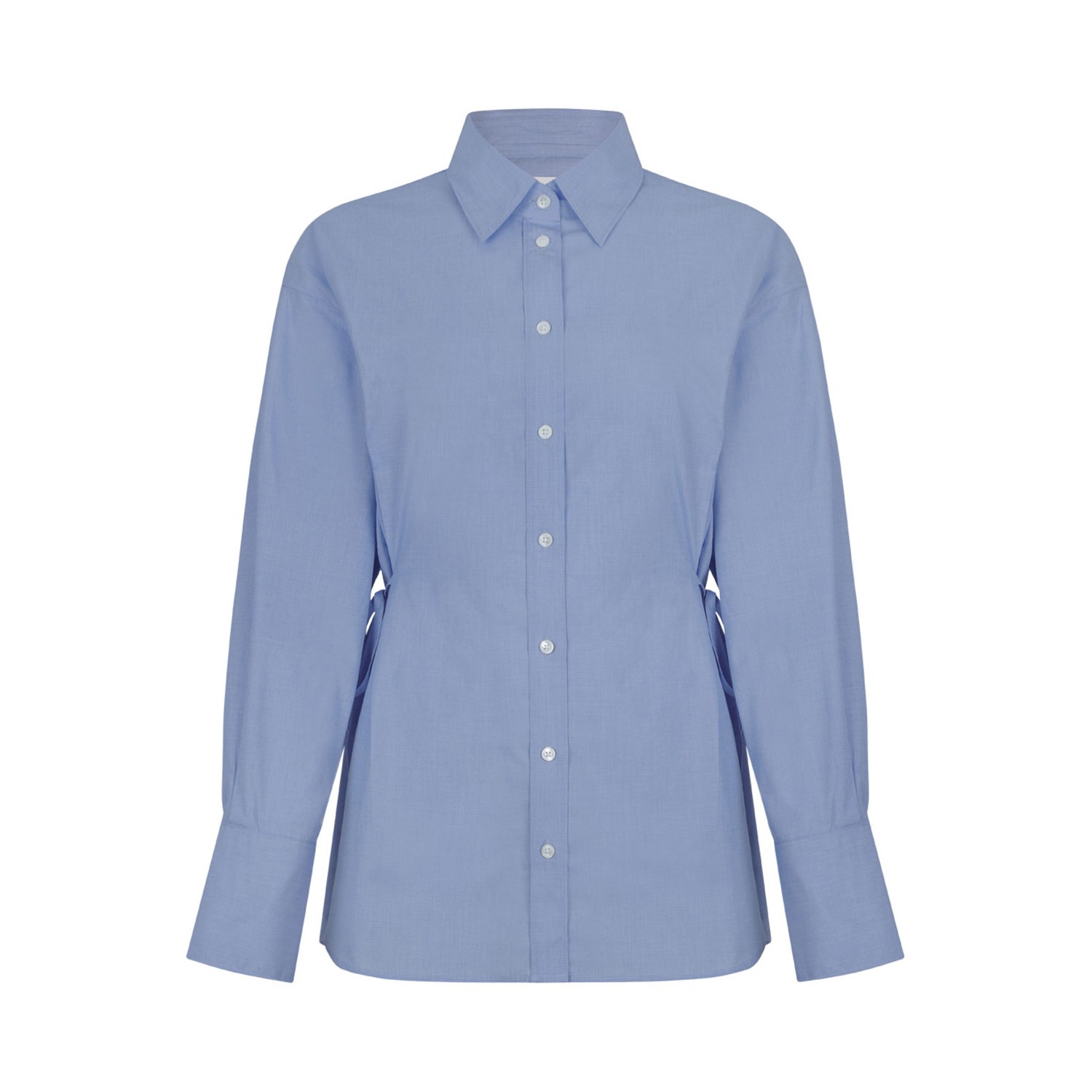 Closed Light Blue Cotton Shirt. Light blue long-sleeve shirt defined by a clean silhouette and modern tailoring. Crafted in soft, breathable cotton, this Closed shirt features a classic pointed collar and front button fastening for a timeless look. The design is enhanced by subtle side waist ties that gently define the silhouette, adding a contemporary and feminine touch. Long sleeves with structured cuffs complete the refined aesthetic. Versatile and effortlessly elegant, this shirt is perfect for polished everyday styling and elevated office wear.