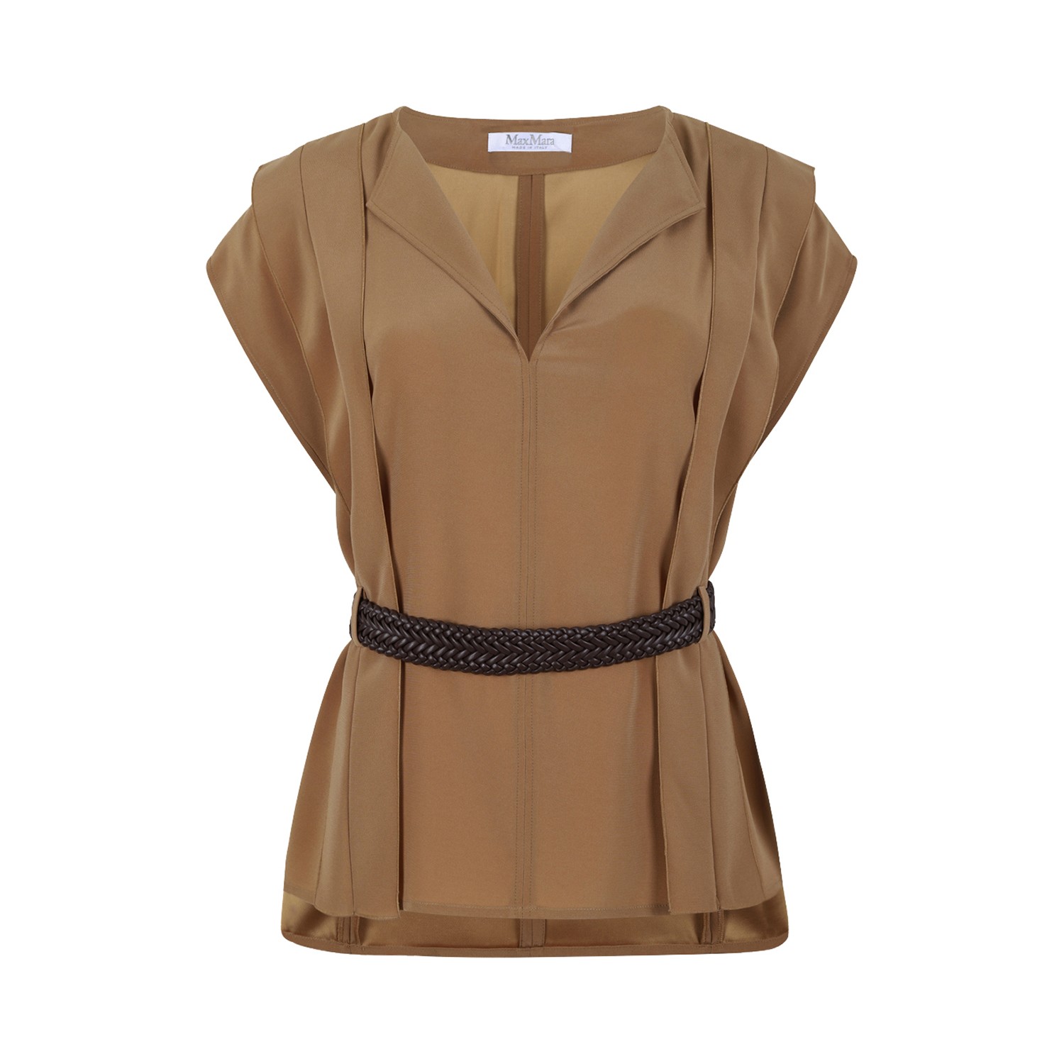 Max Mara Caramel V-Neck Blouse with Belt. Caramel sleeveless blouse crafted in a fluid, lightweight fabric and defined by a clean, contemporary silhouette. Featuring a refined V-neckline and subtle vertical seams, it offers a relaxed yet structured fit. The braided leather belt cinches the waist, creating a flattering shape and adding a sophisticated contrast detail. Elegant and versatile, it is perfect for polished daywear and refined evening looks.