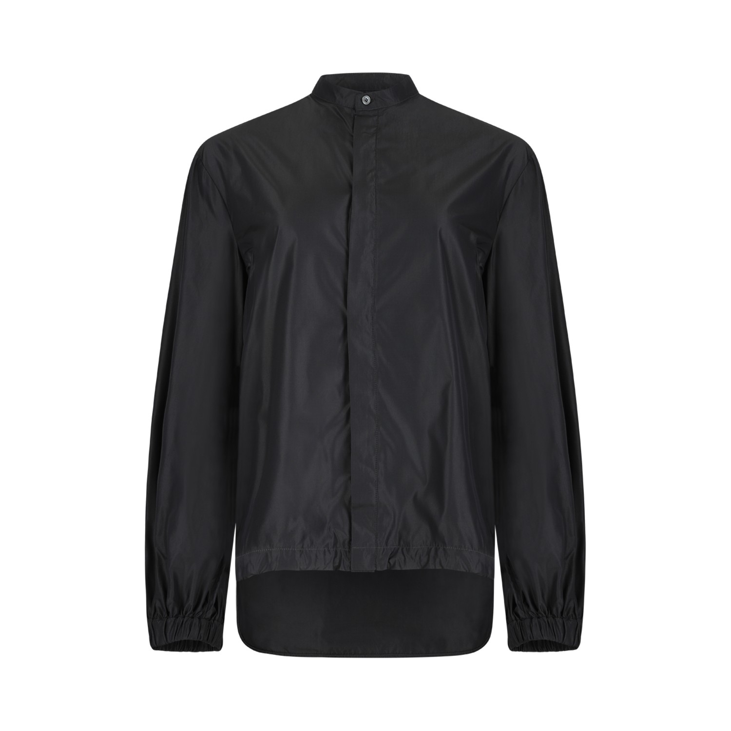 Douuod Navy Technical Drawstring Shirt Jacket. Navy shirt jacket defined by a modern, minimalist silhouette and functional Douuod design. Crafted from lightweight technical fabric, this piece features a clean front zip closure and a classic shirt-style collar that balances casual elegance with contemporary practicality. The long sleeves and relaxed cut ensure comfort and ease of movement, while the adjustable drawstring hem adds subtle structure and allows for a customizable fit. The smooth surface and precise construction highlight the brand