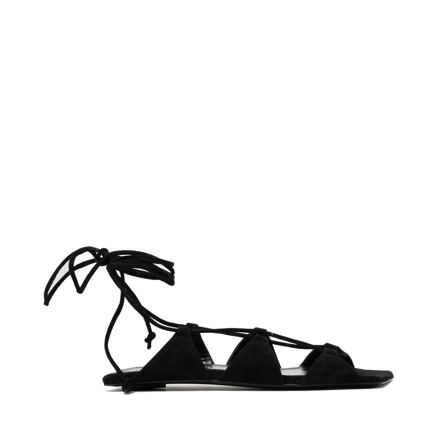 The Attico Black Renee Sandals. Black calf suede sandals, square open toe, crossover strap fastening. Branded leather footbed, low sculptured heel, flat leather sole.