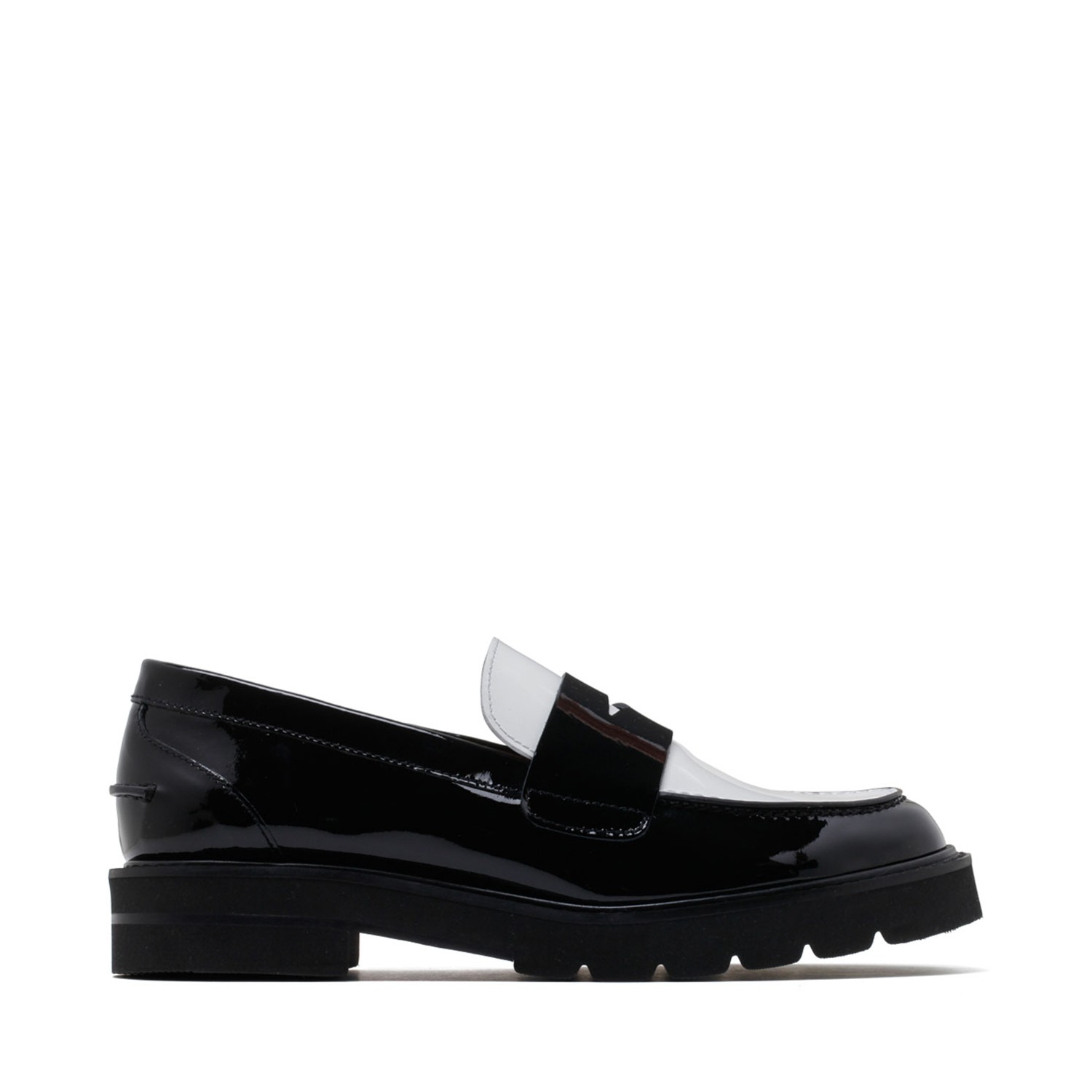 Stuart Weitzman Black and White Leather Penny Loafers. Black and white leather loafers, branded insole, round toe, slip on style, rubber sole and mid block heel.