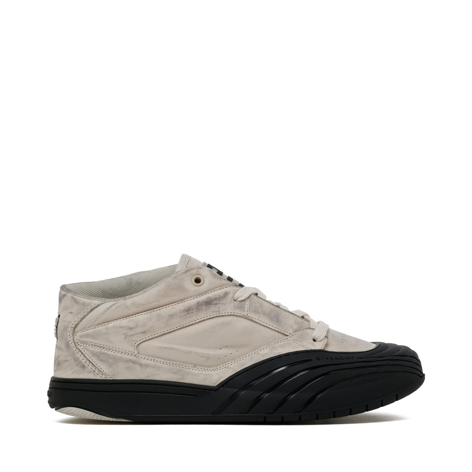 Givenchy Beige Skate Sneakers. Beige technical mid-top sneakers in used effect nubuck and synthetic fibres, show line. Rubber patch on the tongue with 4G emblem and GIVENCHY signature, 4G emblem rubber patch on the back. Givenchy signature embossed on the heel and debossed on the side, rubber protection on the toe, covered laces. Asymmetrical padded collar to protect the ankle, Givenchy 4G debossed on the insole, colored insert on the sole.