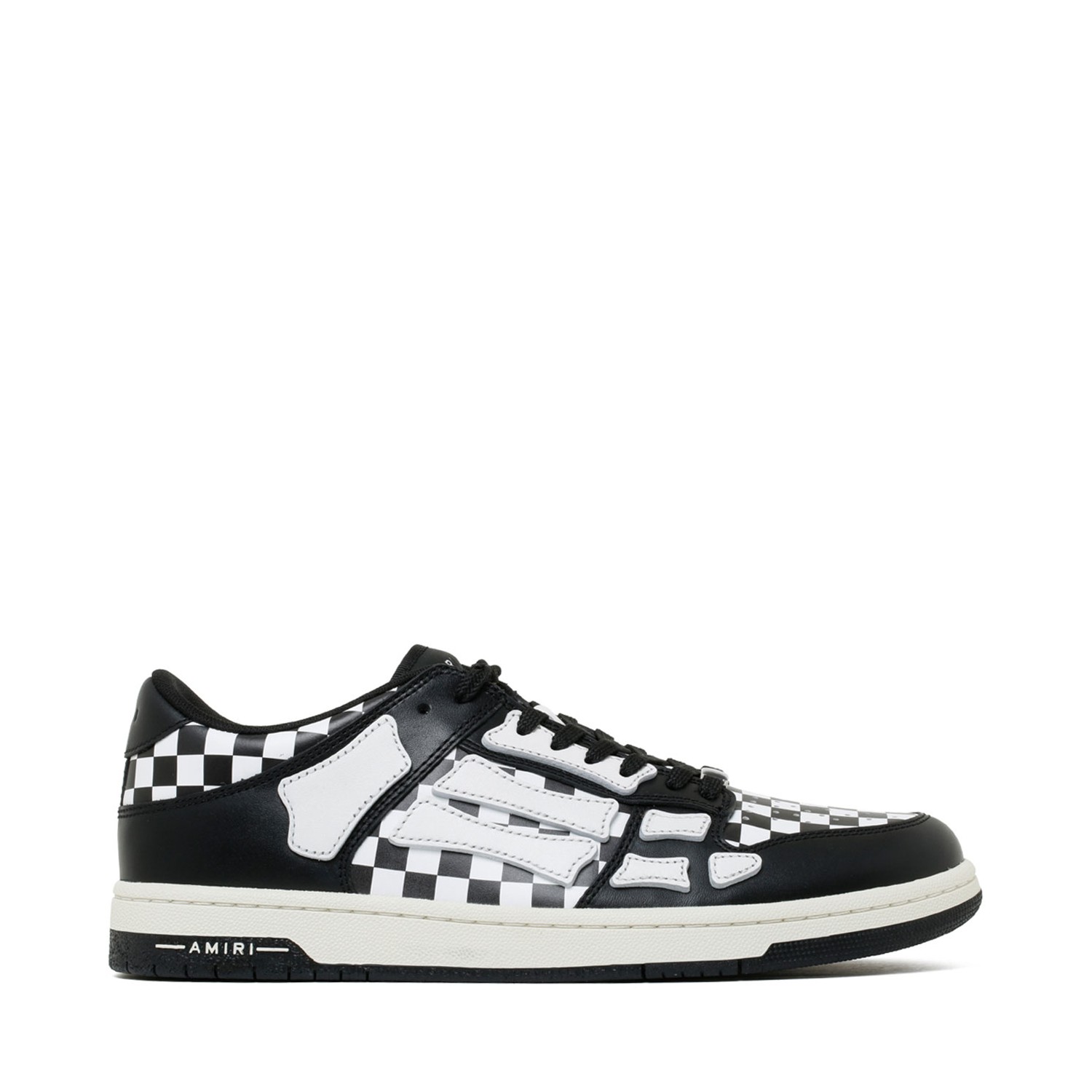 Amiri Skel Top Check Pattern Sneakers. Black and white calf leather sneakers, panelled design, check pattern. Patch detail, round toe, logo plaque to the front, logo patch at the tongue, branded heel counter. Branded insole, rubber sole, front lace up fastening.