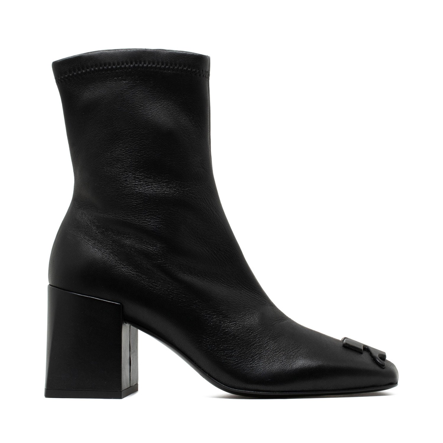 Courreges Black Reedition Ankle Boots. Black heritage stretch leather ankle boots with square heel and embossed AC logo.