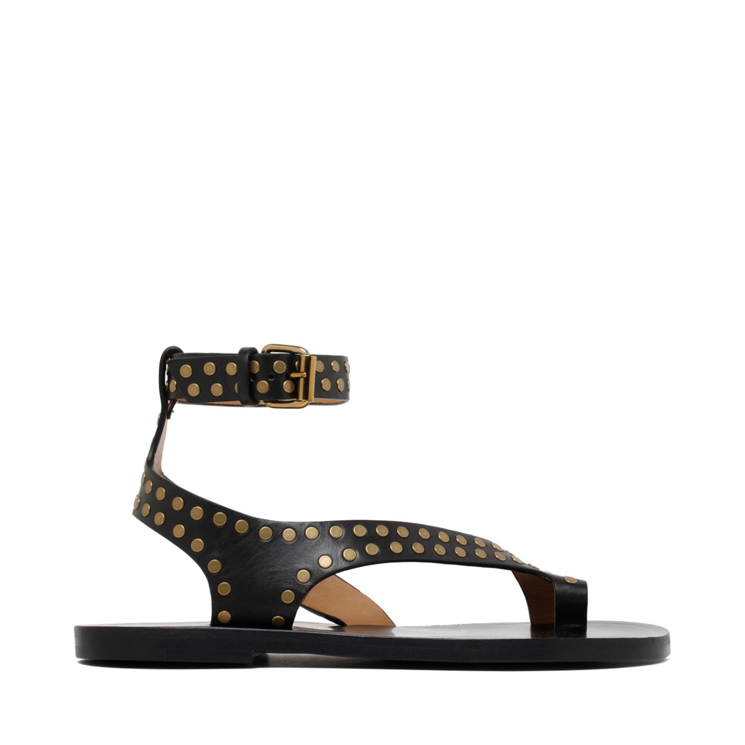 Isabel Marant Low Black Jiona Sandals with gold studs. Buckled ankle strap. Made of cowhide leather.