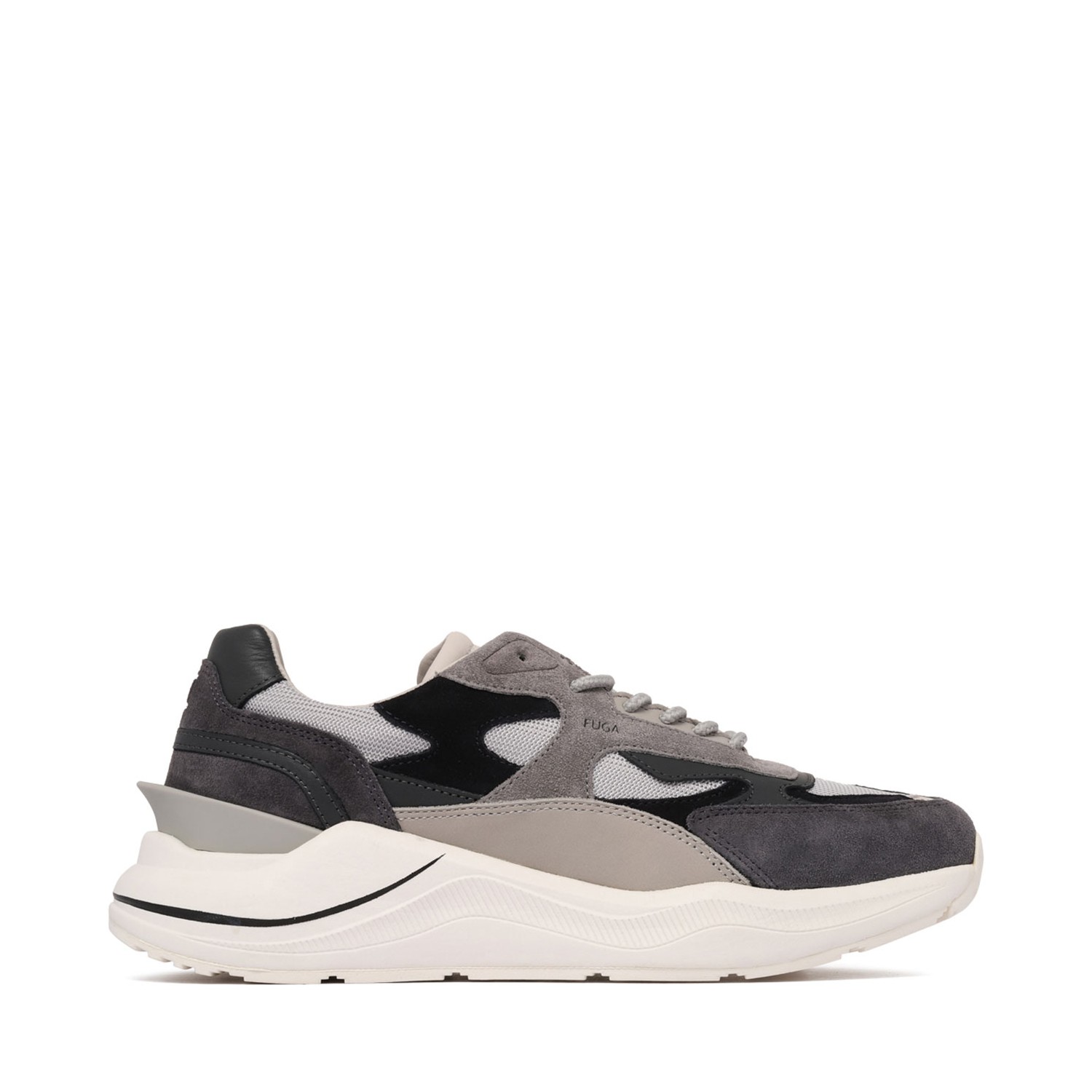 D.A.T.E. Fuga Sneakers. Anthracite grey and light grey calf suede and calf leather sneakers, multi panel design, front lace-up fastening, branded heel counter. Rubber applique detailing to the back, mesh panelling, logo print to the side, logo-print tongue. Round toe, padded ankle, branded insole, French terry lining, flat rubber sole.