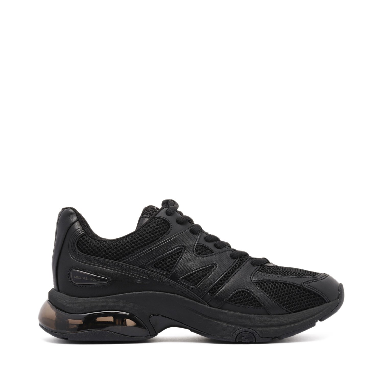 Michael Kors Black Kit Extreme Sneakers. Black mesh and leather sneakers, round toe, lace up closure, slim design.
