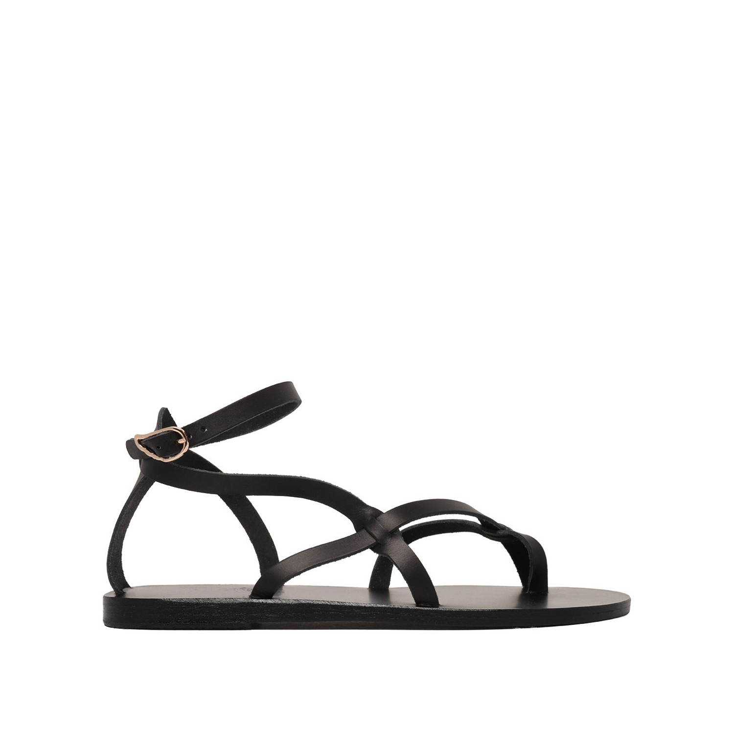 Ancient Greek Black Tomi Sandals. Black leather sandals, straps enclosing the toe and running across the foot, plus an ankle strap for a secure fit.