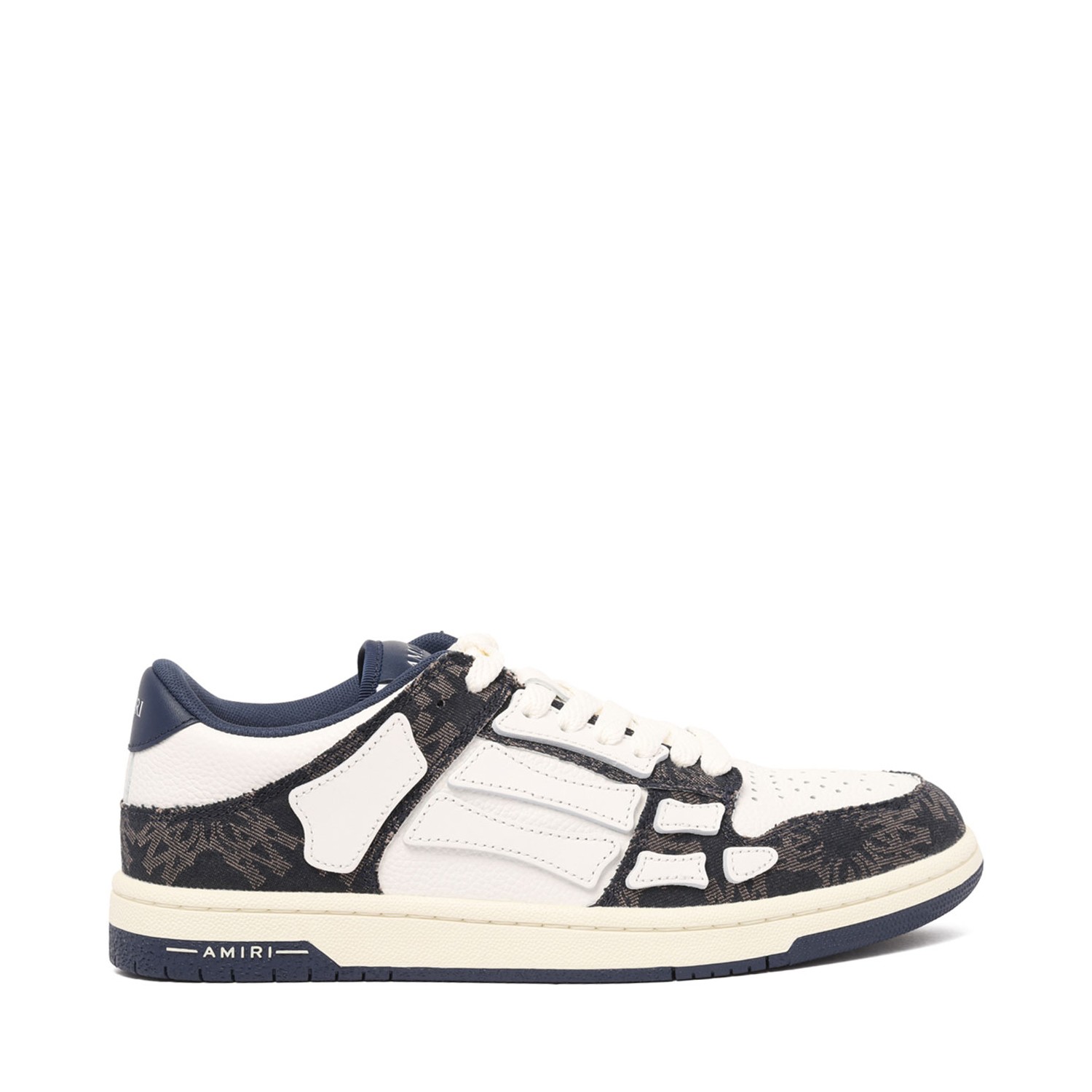 Amiri Ma Quad Skel Sneakers. The Ma Quad Skel top low is crafted in leather with Ma Quad jacquard denim paneling on a two tone, rubber sole with perforated detailing and signature graphics.