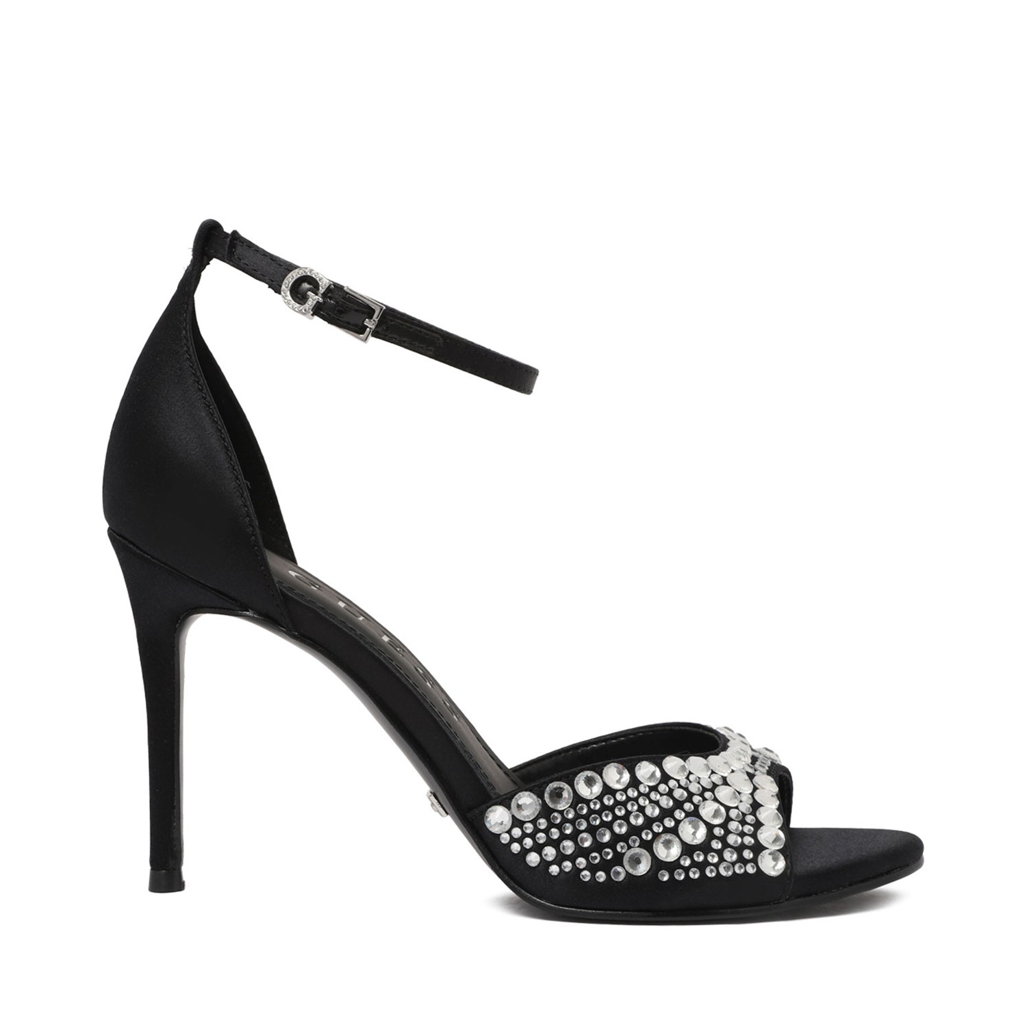 Guess Black Kable Sandals. Black Kable sandals, buckle-fastening ankle strap, silver-tone logo plaque, high stiletto heel, almond open toe.