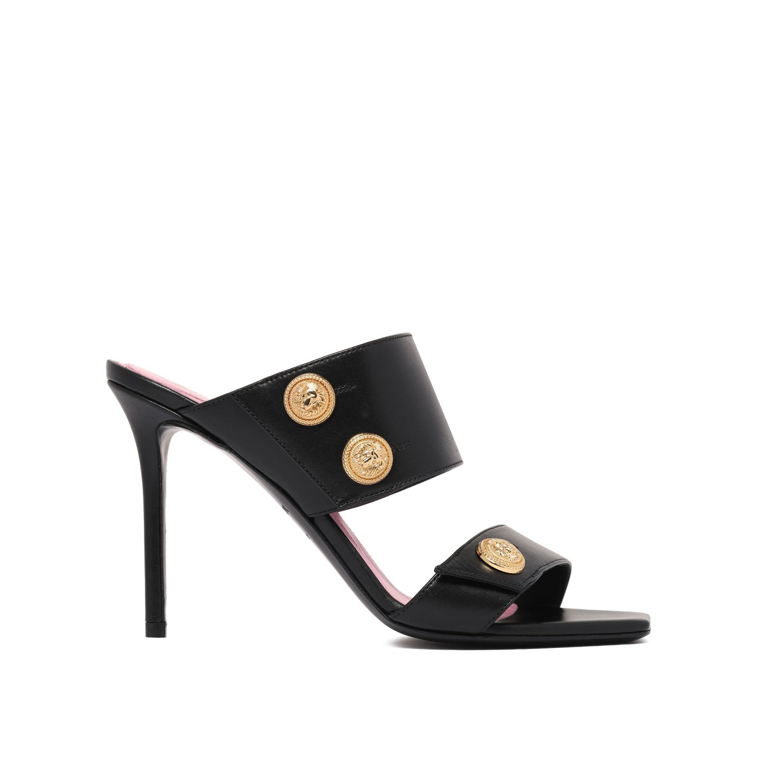 Balmain Black Eva Heeled Sabot. Black calfskin heeled sabot, square open end, straps with decorative